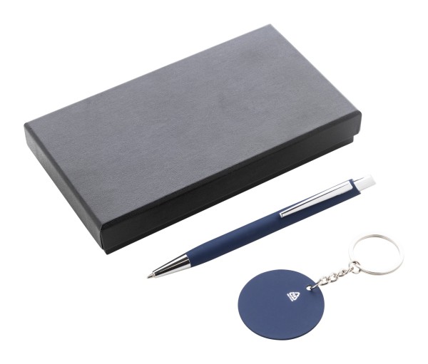 Set cadou din 2 piese, în cutie cadou din hârtie neagră. Include pix din aluminiu reciclat cu finisaj cauciucat și mină albastră și breloc din oțel inoxidabil reciclat cu finisaj cauciucat. Ambele articole au un strat special pentru gravarea cu laser în oglindă.