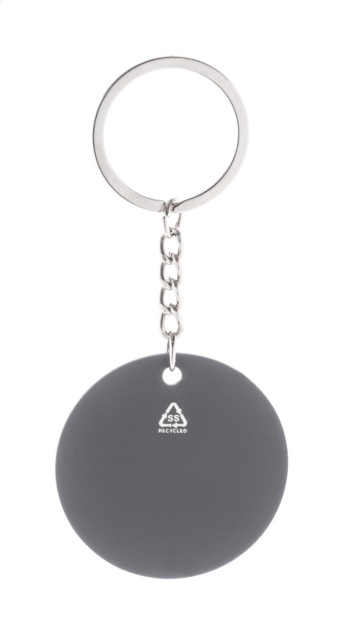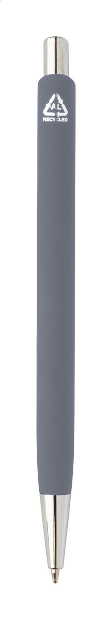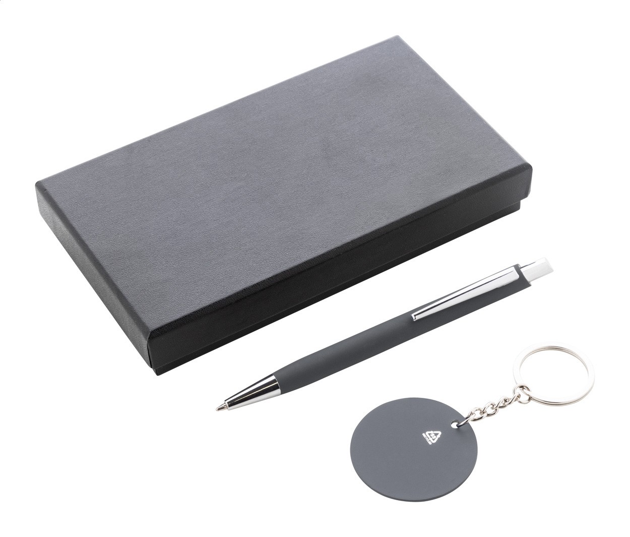 Set cadou din 2 piese, în cutie cadou din hârtie neagră. Include pix din aluminiu reciclat cu finisaj cauciucat și mină albastră și breloc din oțel inoxidabil reciclat cu finisaj cauciucat. Ambele articole au un strat special pentru gravarea cu laser în oglindă.
