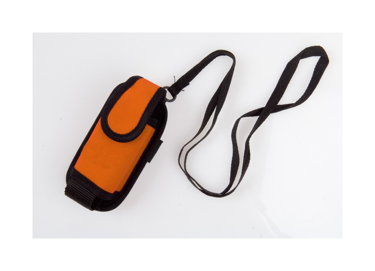 Husa telefon mobil cu inchidere velcro, fixabil pe curea, prevazut cu snur de agatat la gat. Material: poliester 300D.