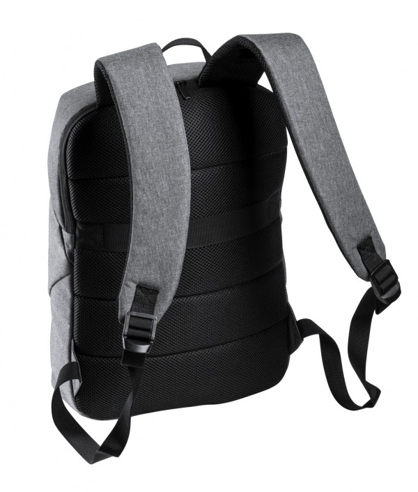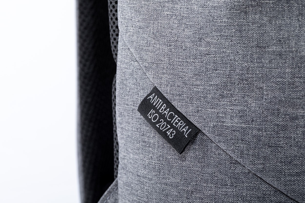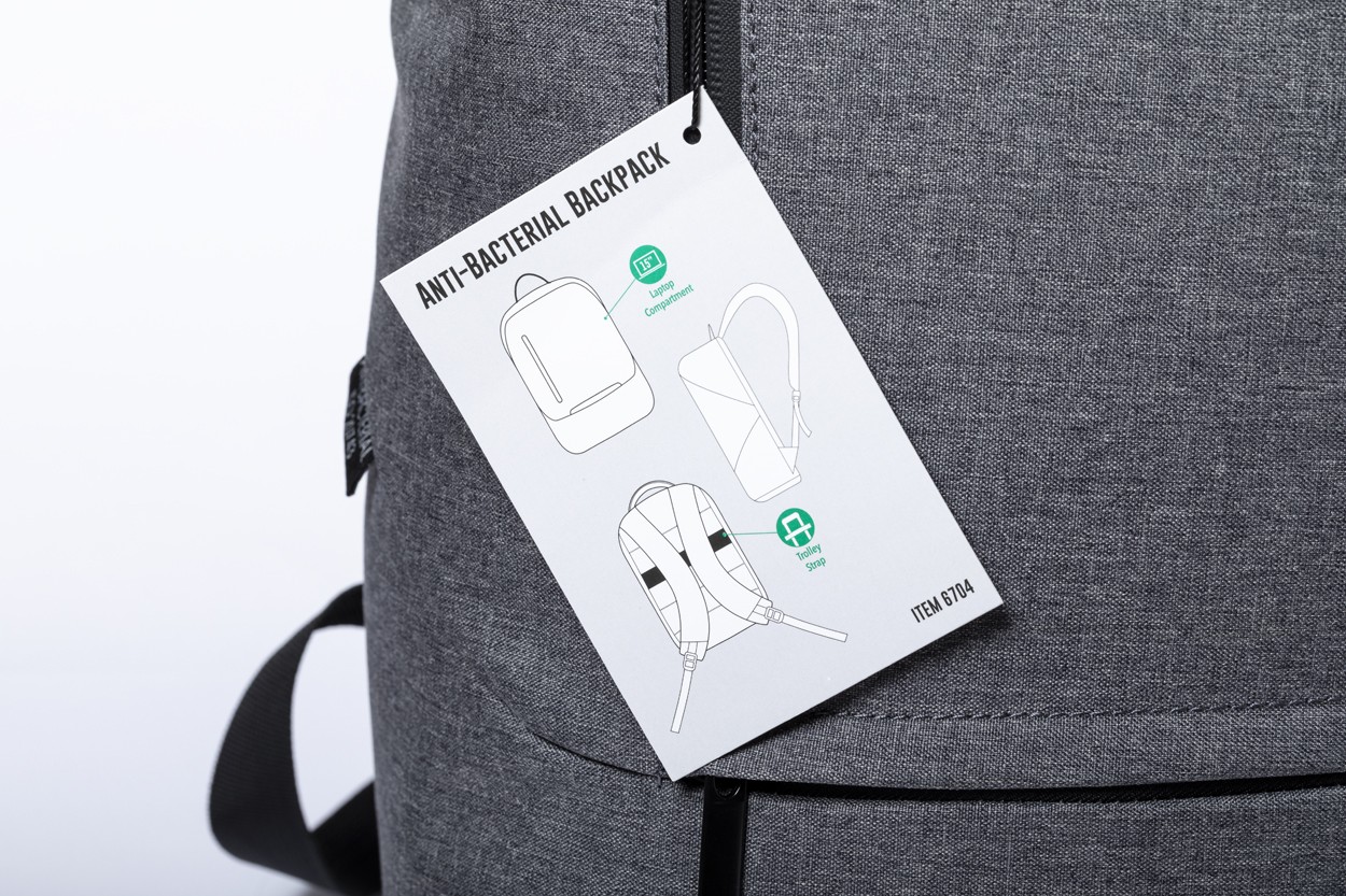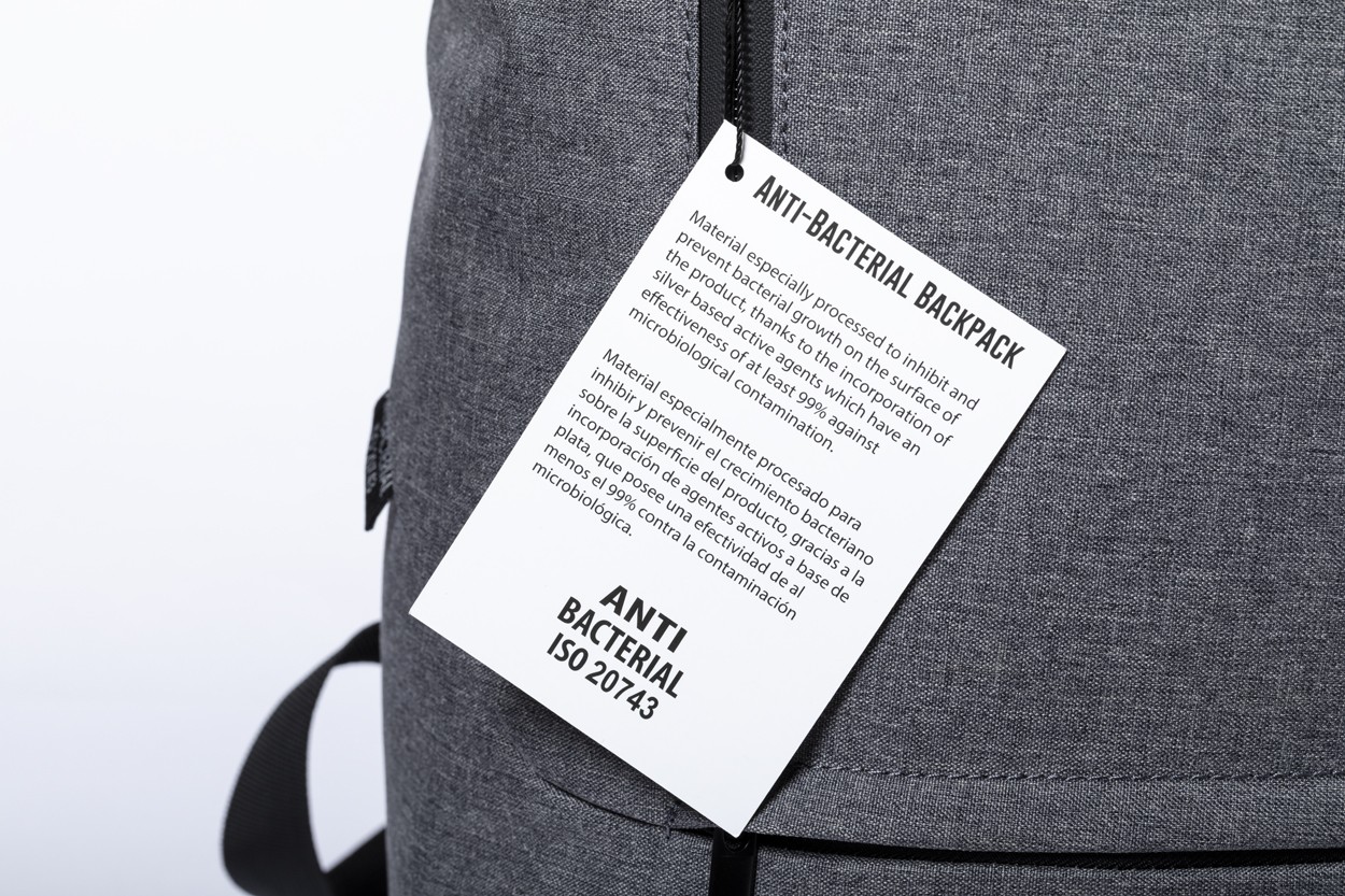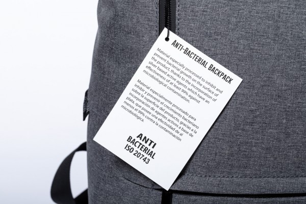 Rucsac din poliester antibacterian, cu compartiment pentru laptop (15 "), curea pentru valiza, spate si bretele captusite. Poliester 600D. Conform ISO 20743.