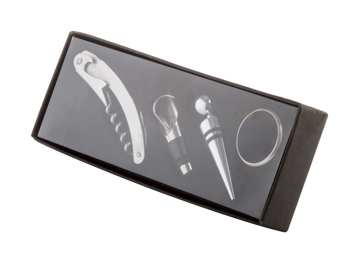 4 accesorii pentru vin în cutie neagră de cadou.