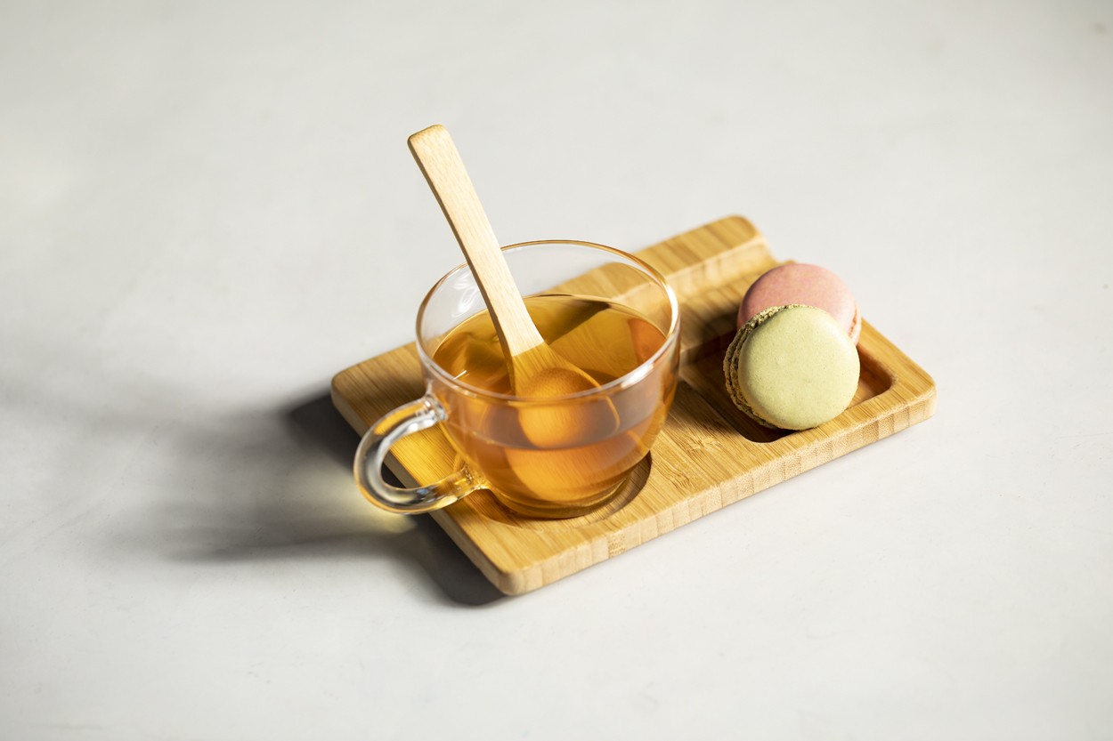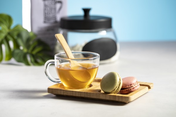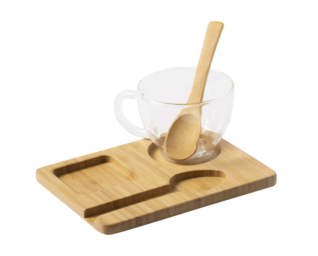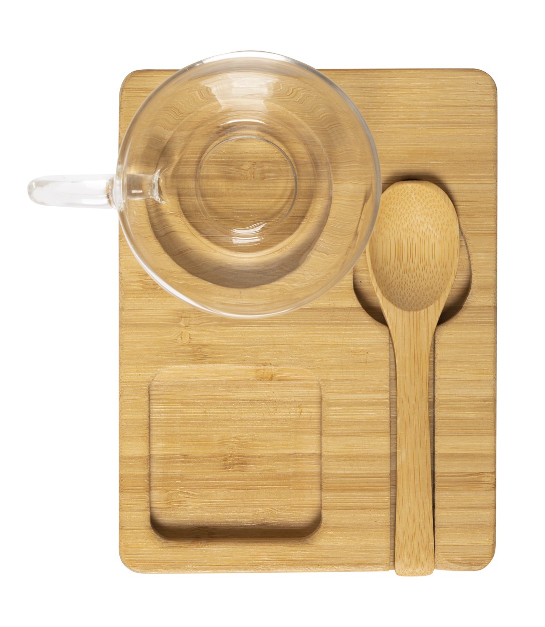 Set de ceașcă din sticlă borosilicată cu tavă de bambus și lingură, 180 ml. În cutie de hârtie kraft.