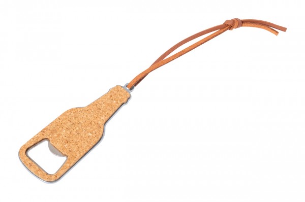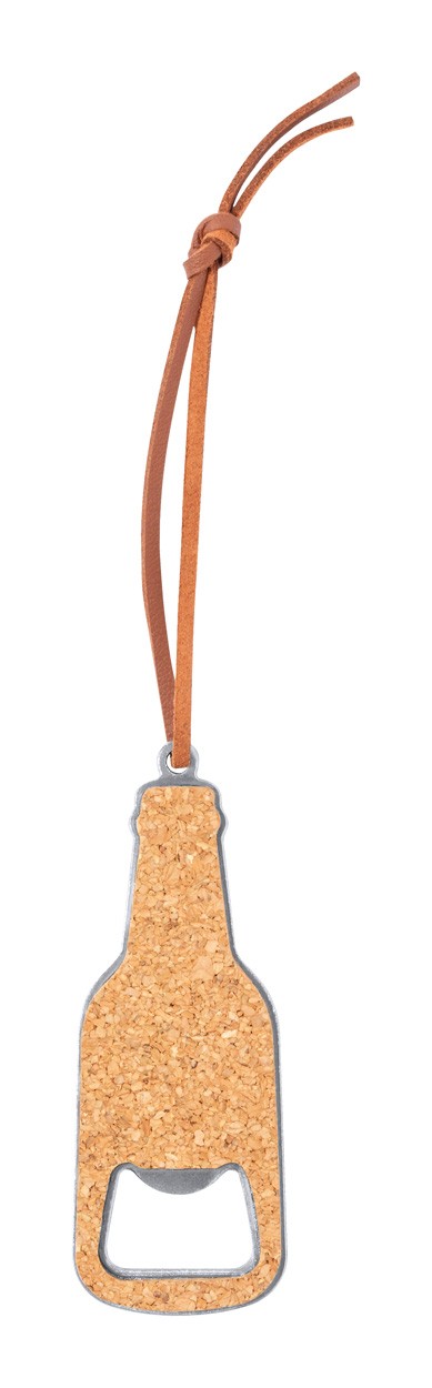 Desfăcător de sticle, din plută naturală, în formă de sticlă, cu șnur de agățat.