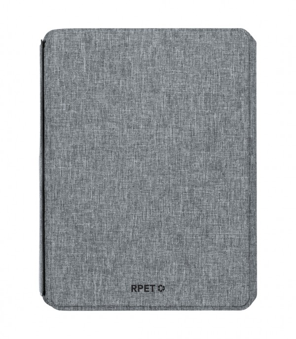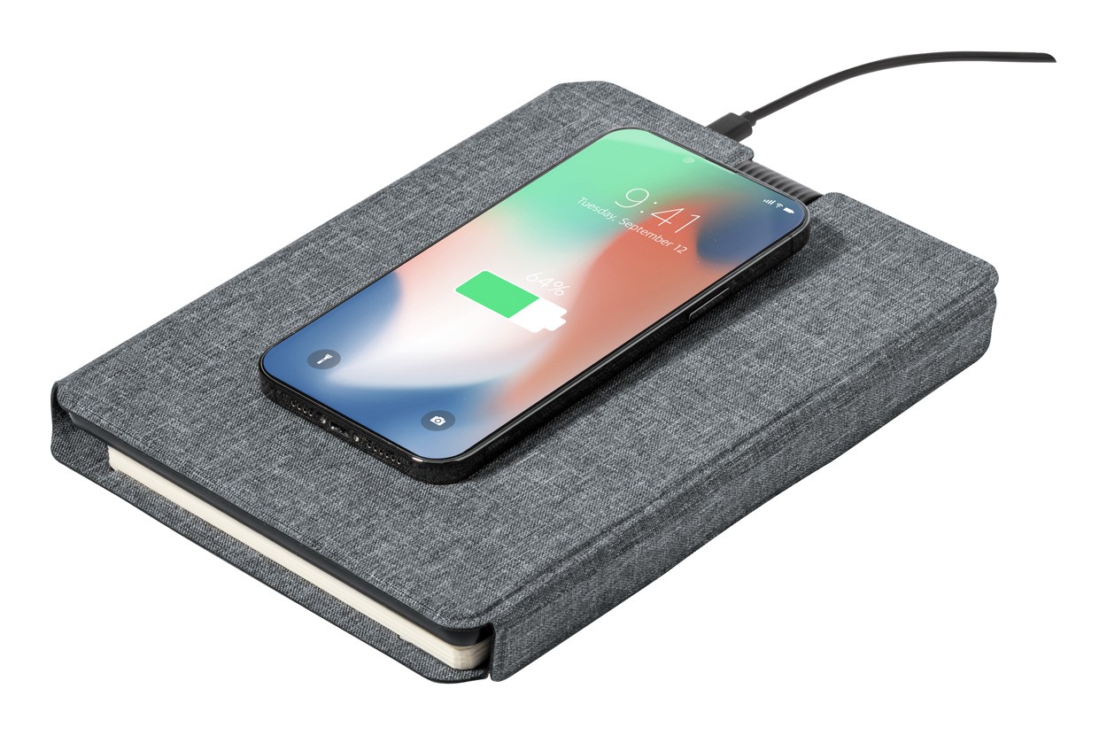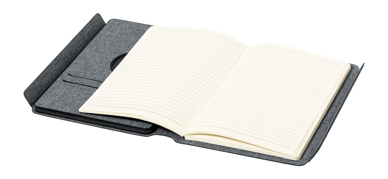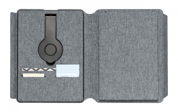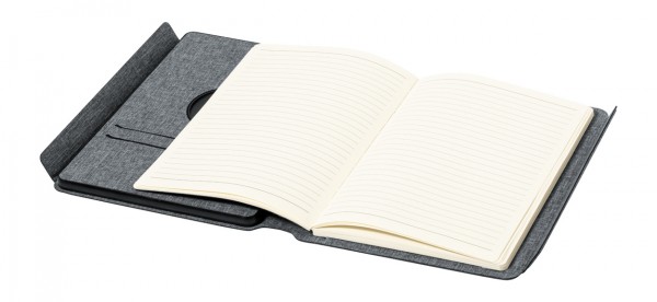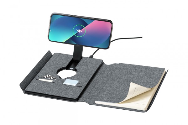 Agendă cu copertă din poliester 300D RPET și 65 de file. Cu o bancă de alimentare de 5000 mAh (cu port de încărcare USB-C și intrare USB-C) și un încărcător rapid magnetic-inductiv pliabil cu două fețe (10W). Compatibil cu Apple Watch® și iPhone® 12 sau o versiune ulterioară. Inclusiv cablu de încărcare USB.