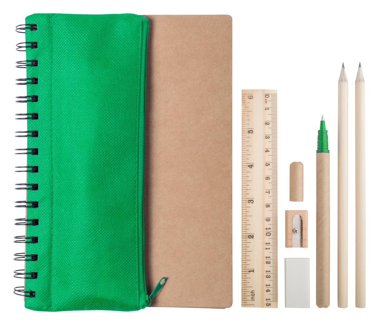 Blocnotes spiralat cu copertă din hârtie reciclată, cu 70 de foi și penar din material nețesut. Cu riglă, 2 creioane din lemn, radieră, ascuțitoare și pix. Cu mină albastră.