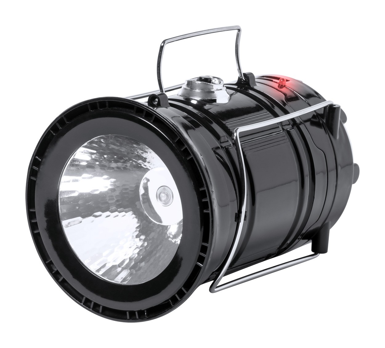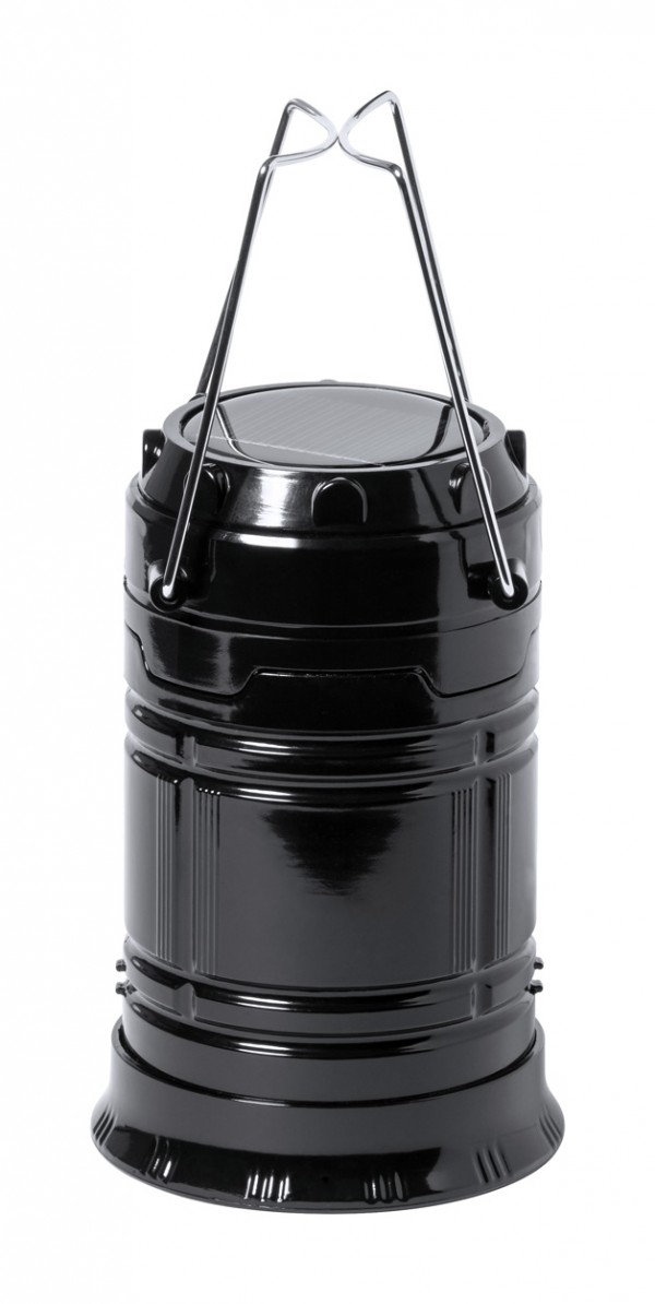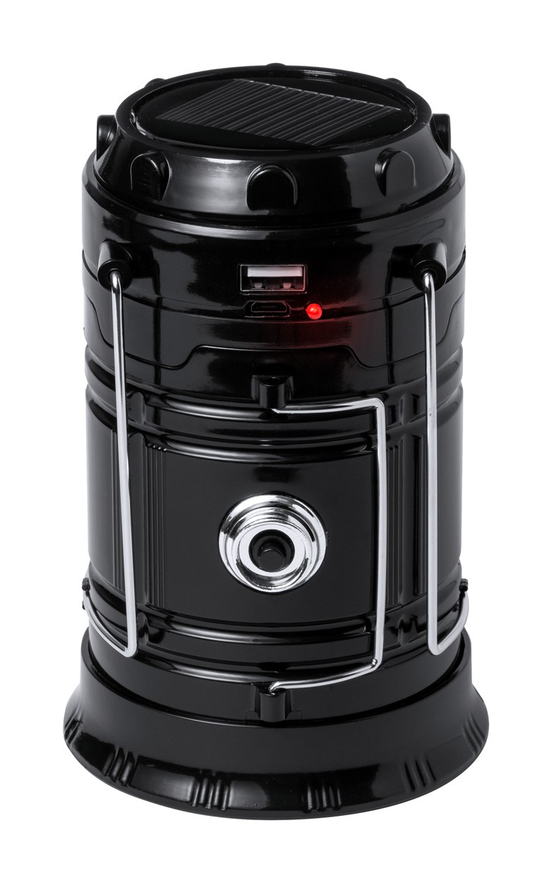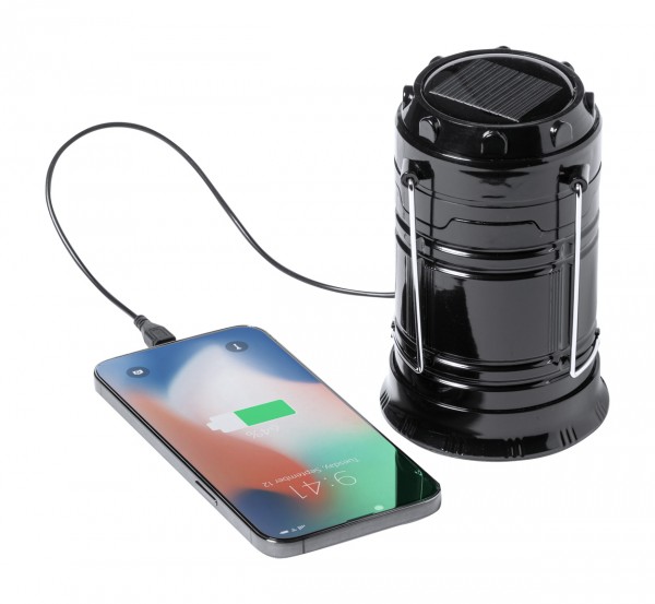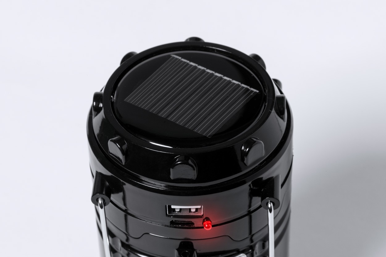 Lanternă de camping alimentată cu energie solară cu 7 LED-uri. Funcție de power bank încorporată cu baterie de 1200 mAh și port USB pentru încărcător.