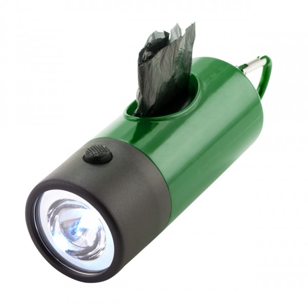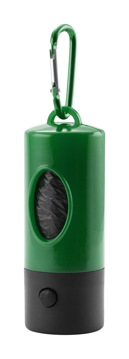 Suport din plastic în formă de os cu 15 saci de gunoi, cu 1 LED și carabină din aluminiu. Se livrează cu baterii.