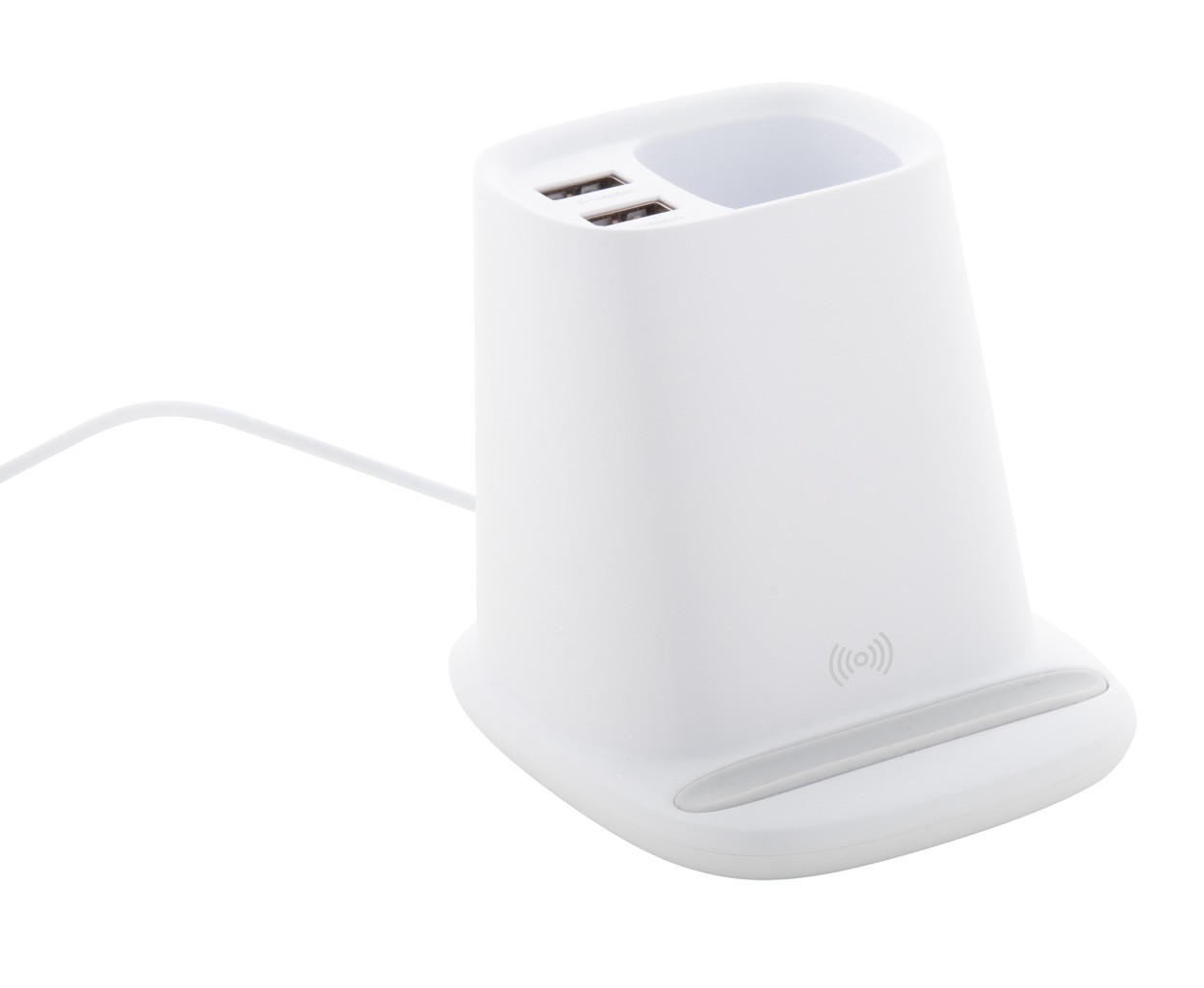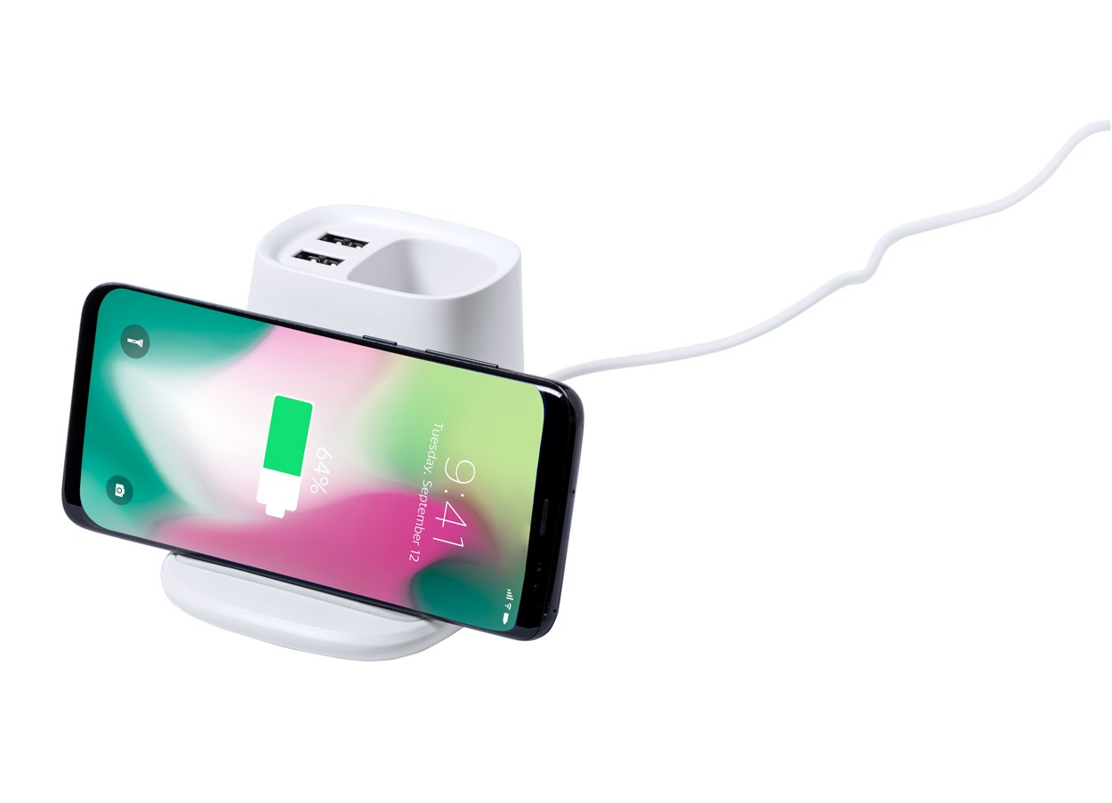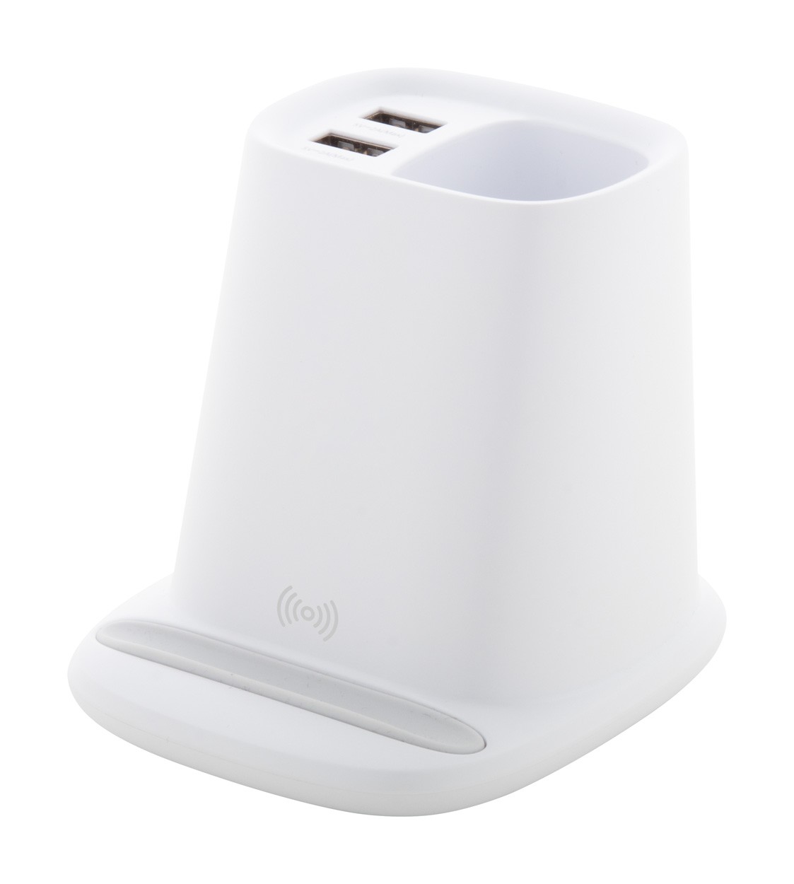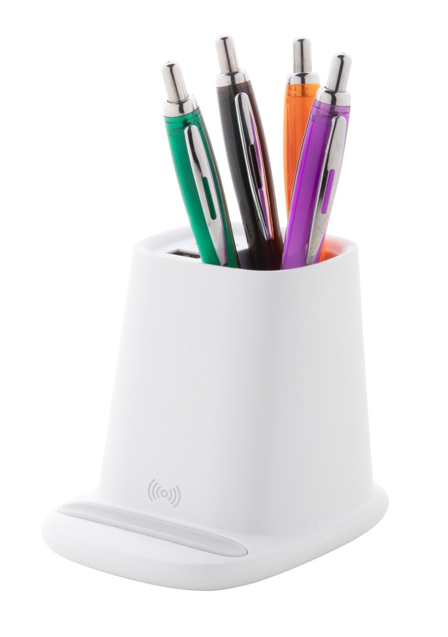 Suport multifuncțional pentru pixuri, din plastic, cu suport pentru telefon, încărcător rapid wireless incorporat (10W) si 2 porturi USB pentru încărcător (iese max 2000 mA). Inclusiv cablu de încărcare USB.
