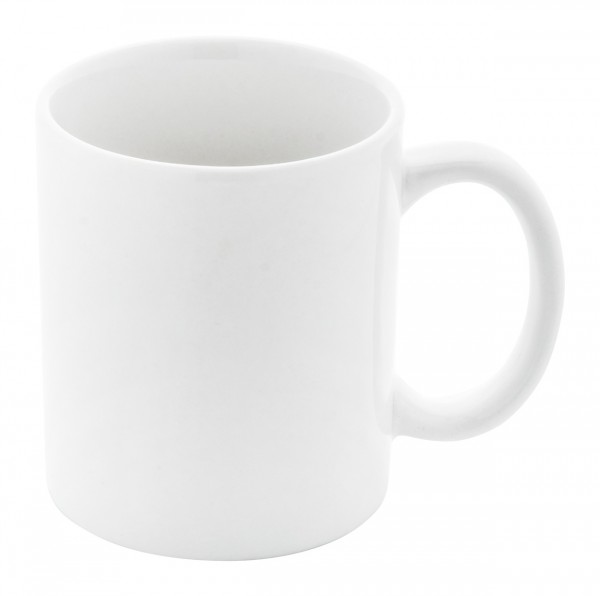 Cană ceramică albă pentru imprimare prin sublimare, lavabilă în mașina de spălat vase, 300 ml. În cutie de hârtie albă.