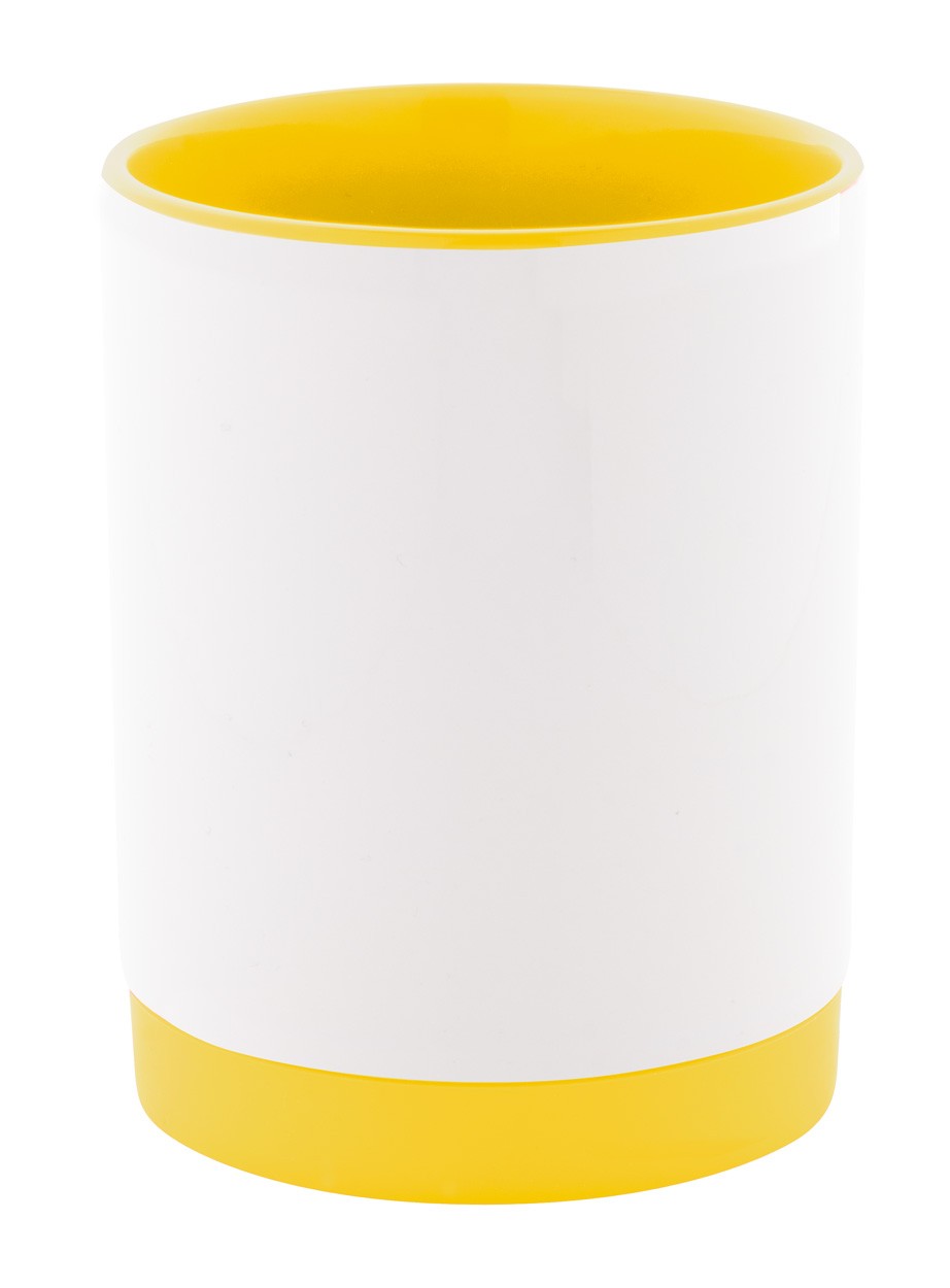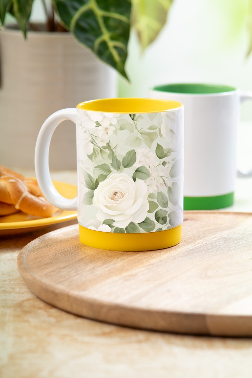 Cană pentru sublimare din ceramică, cu interior colorat și inel din silicon de culoare asortată, în partea de jos, 300 ml. În cutie de hârtie albă.