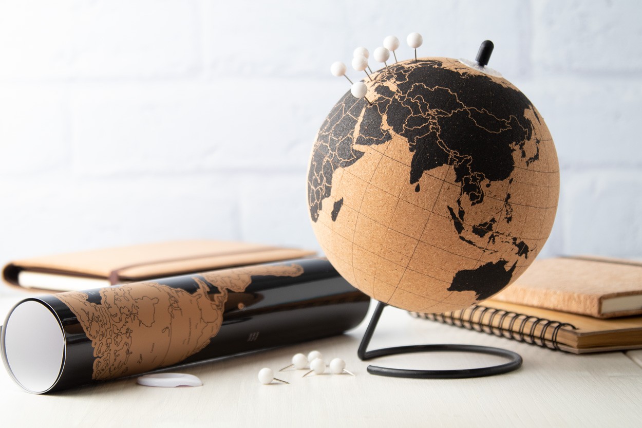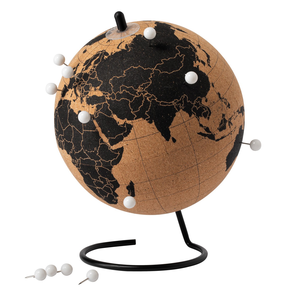 Glob pământesc din plută cu suport metalic, cu 12 buc ace. În cutie de cadou din hârtie kraft.