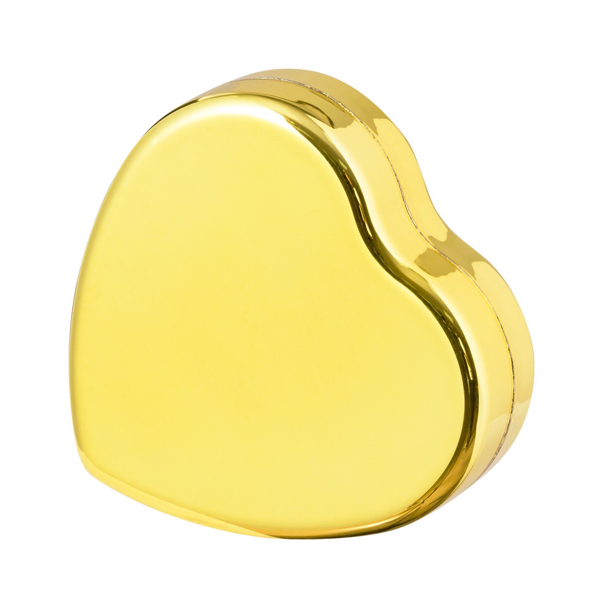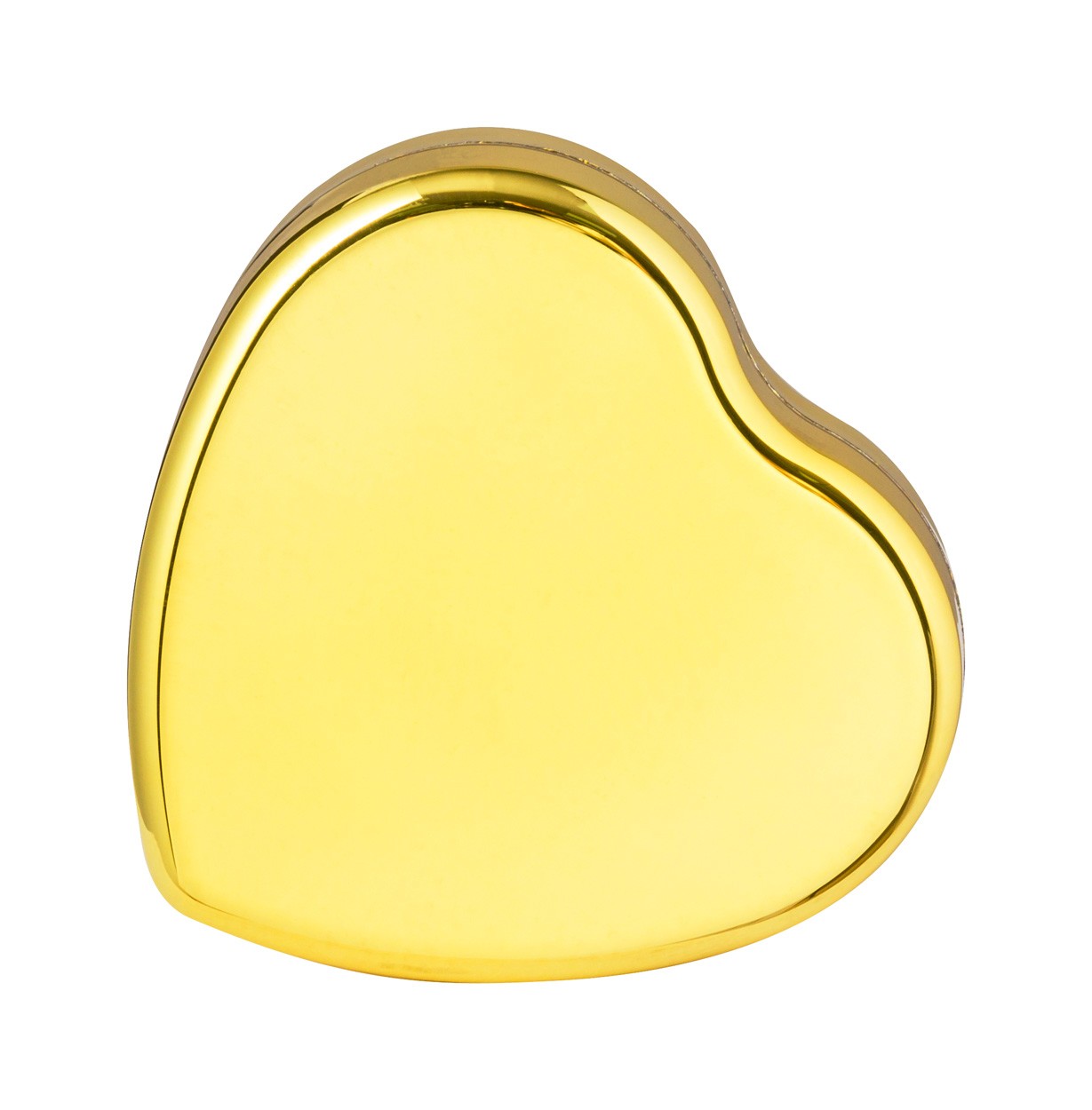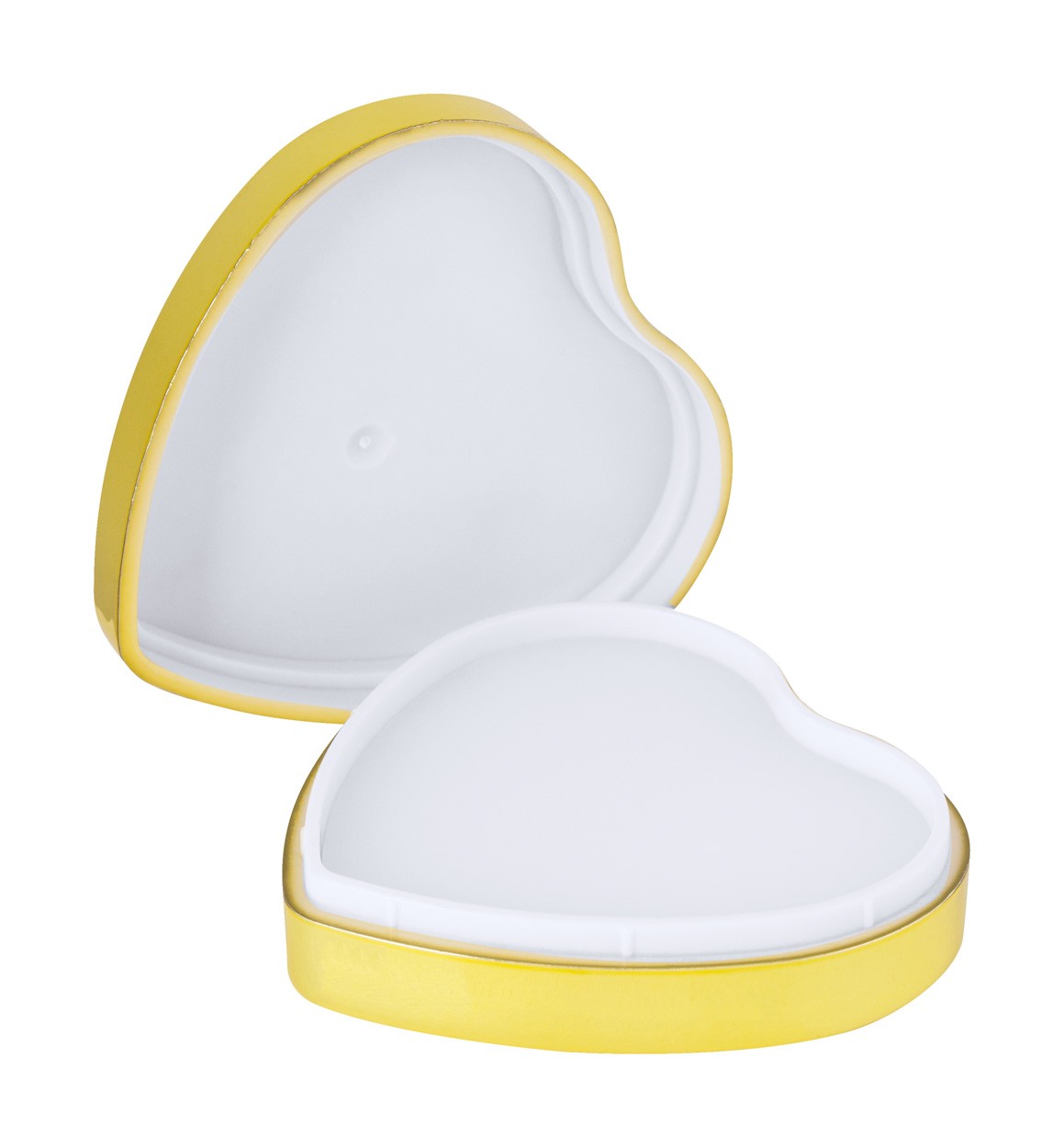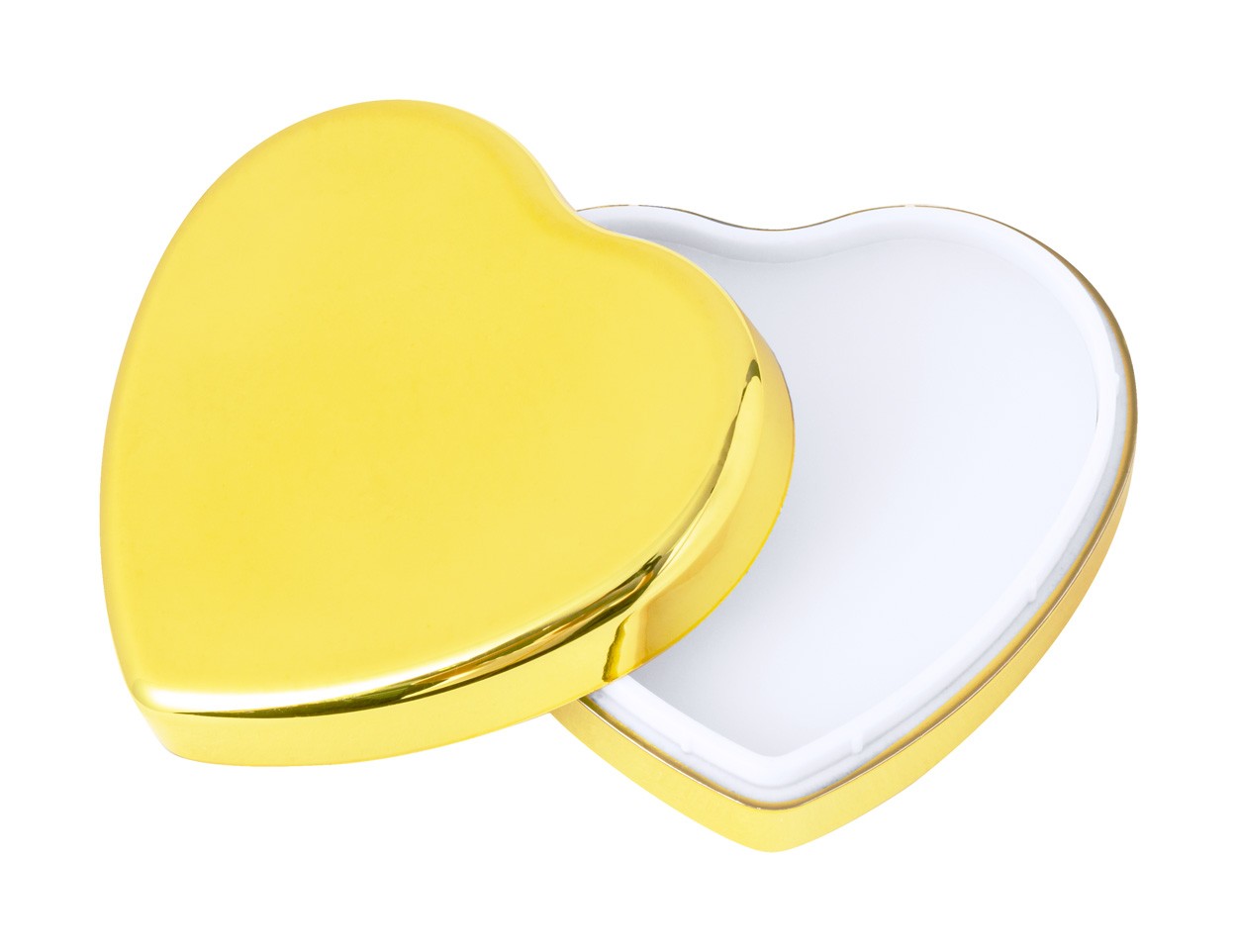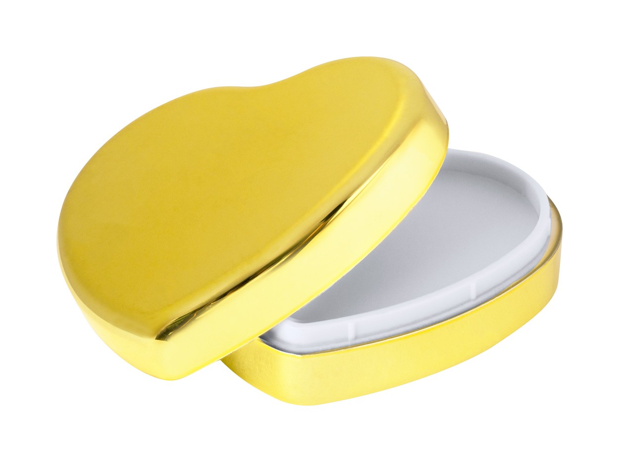 Balsam de buze, cu parfum de vanilie, cu protecție SPF15, în carcasă metalică în formă de inimă.
