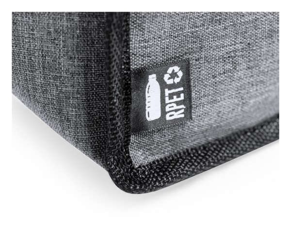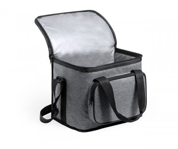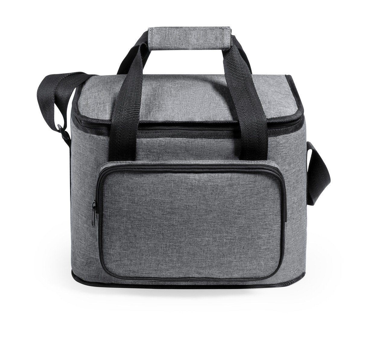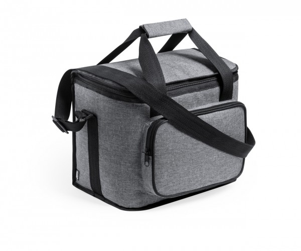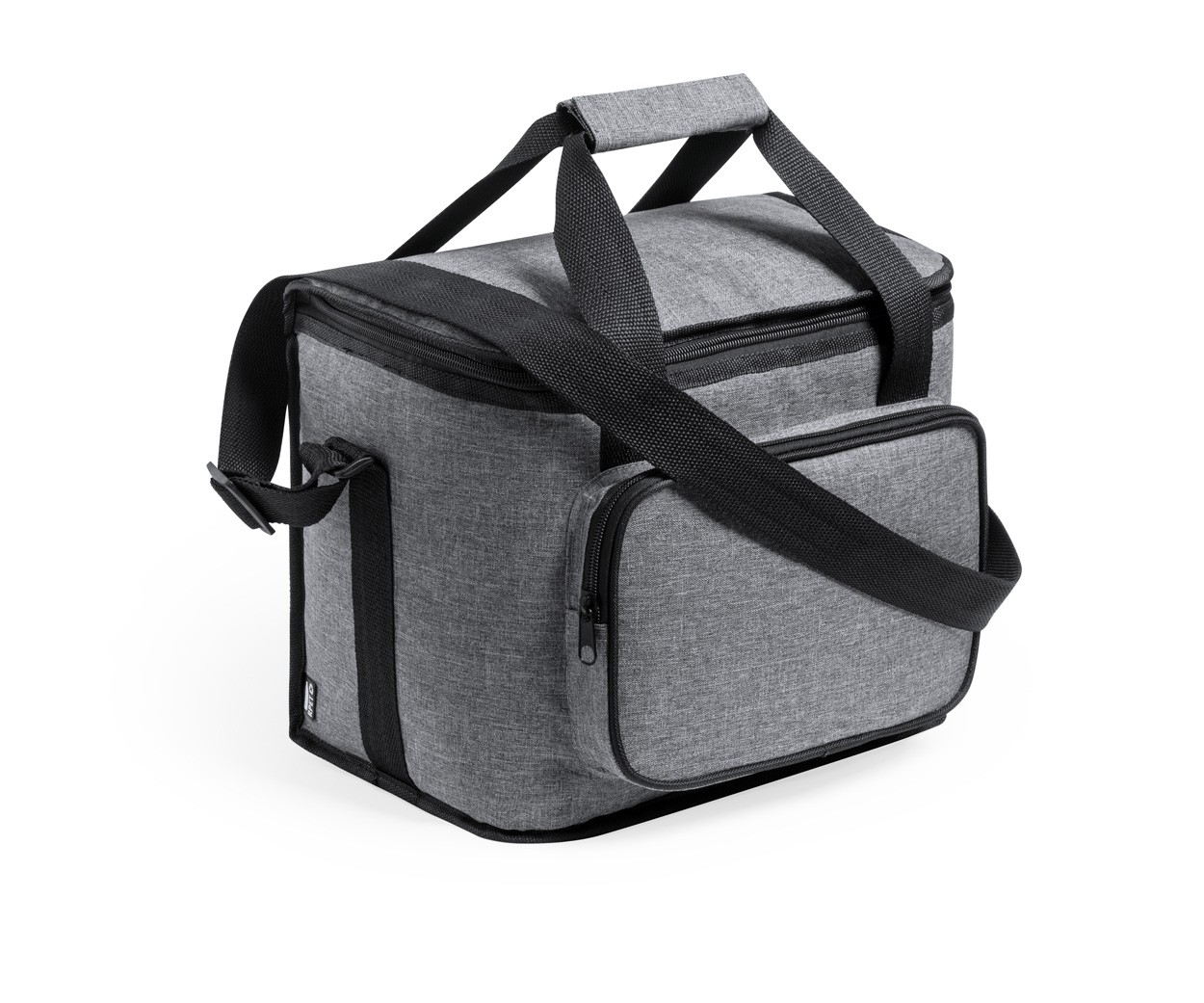 Geantă de răcire RPET cu căptușeală PEVA, compartimente cu fermoar, mânere cu velcro și curea de umăr reglabilă. Cu etichetă distinctă RPET. Poliester 600D RPET.