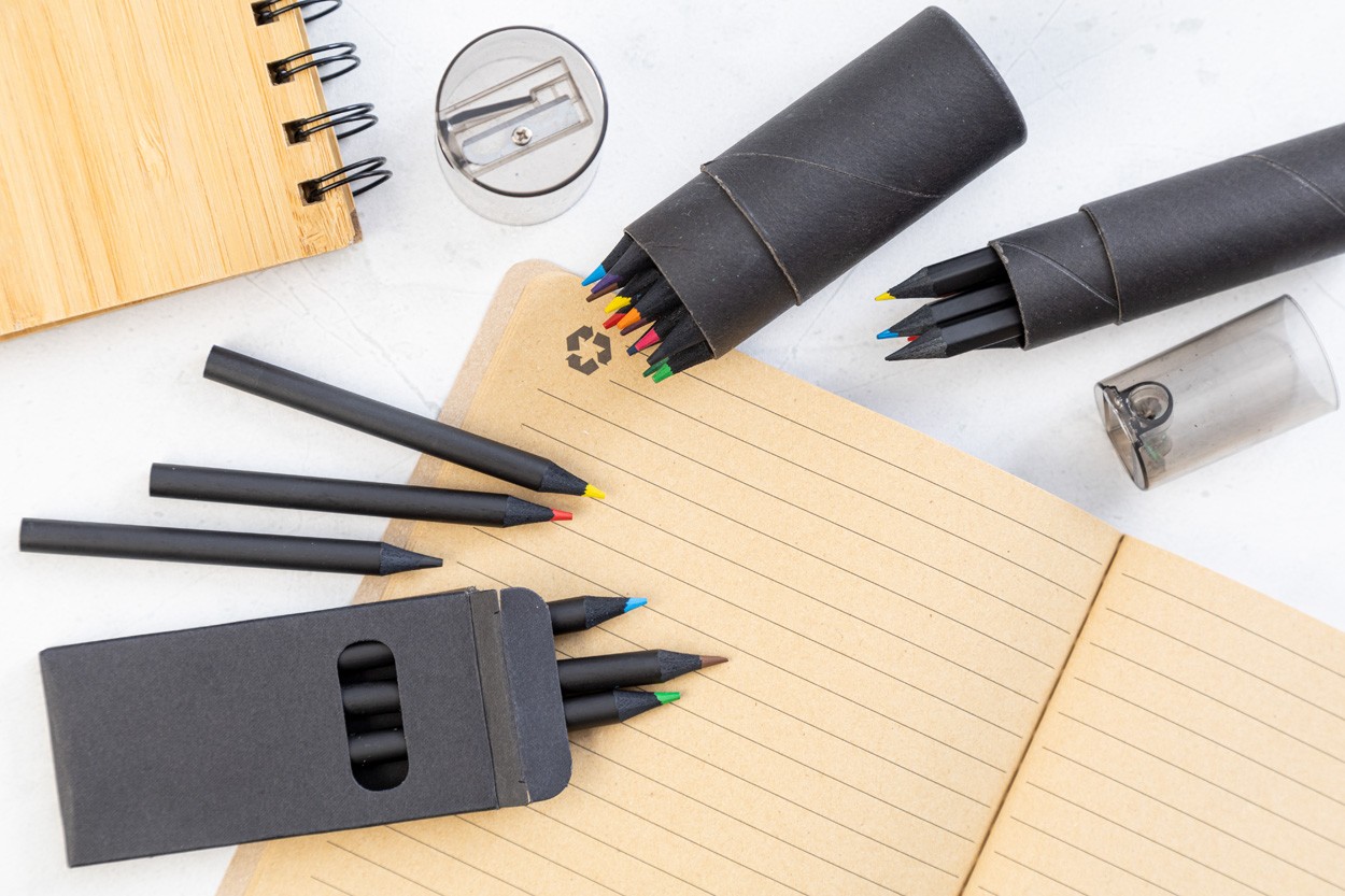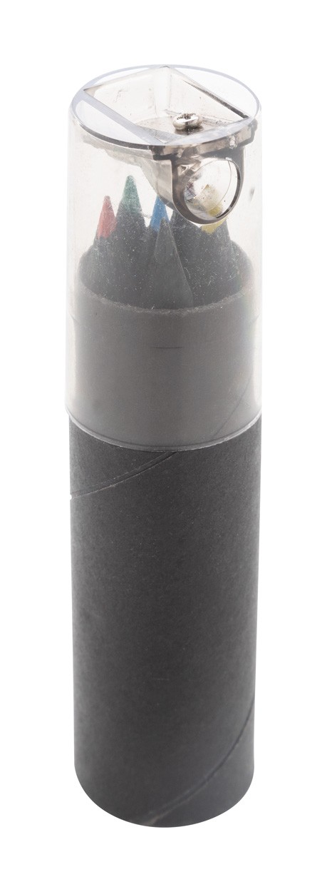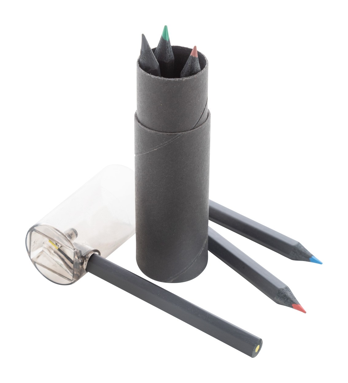 Set de 6 creioane colorate, din lemn negru, în carcasă rotundă de carton negru, cu ascuțitoare din plastic.