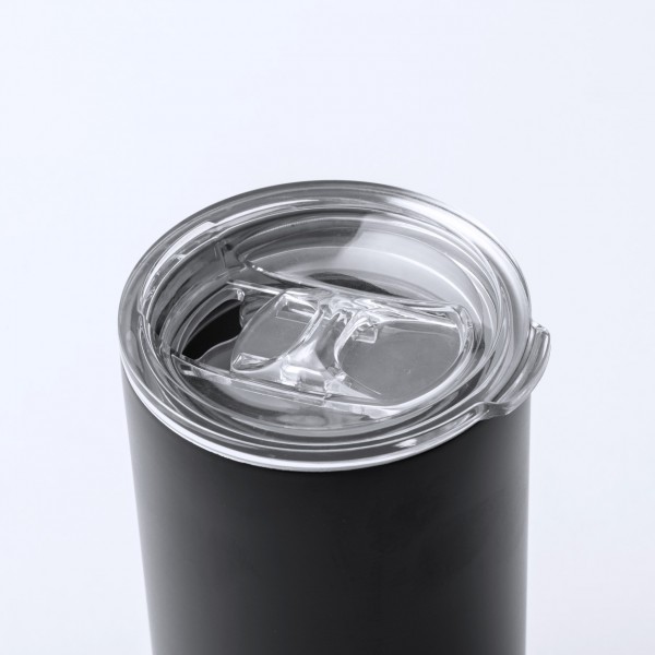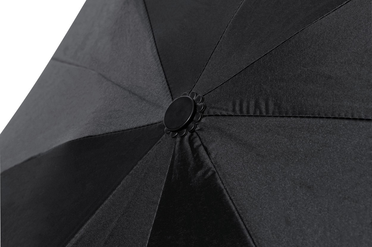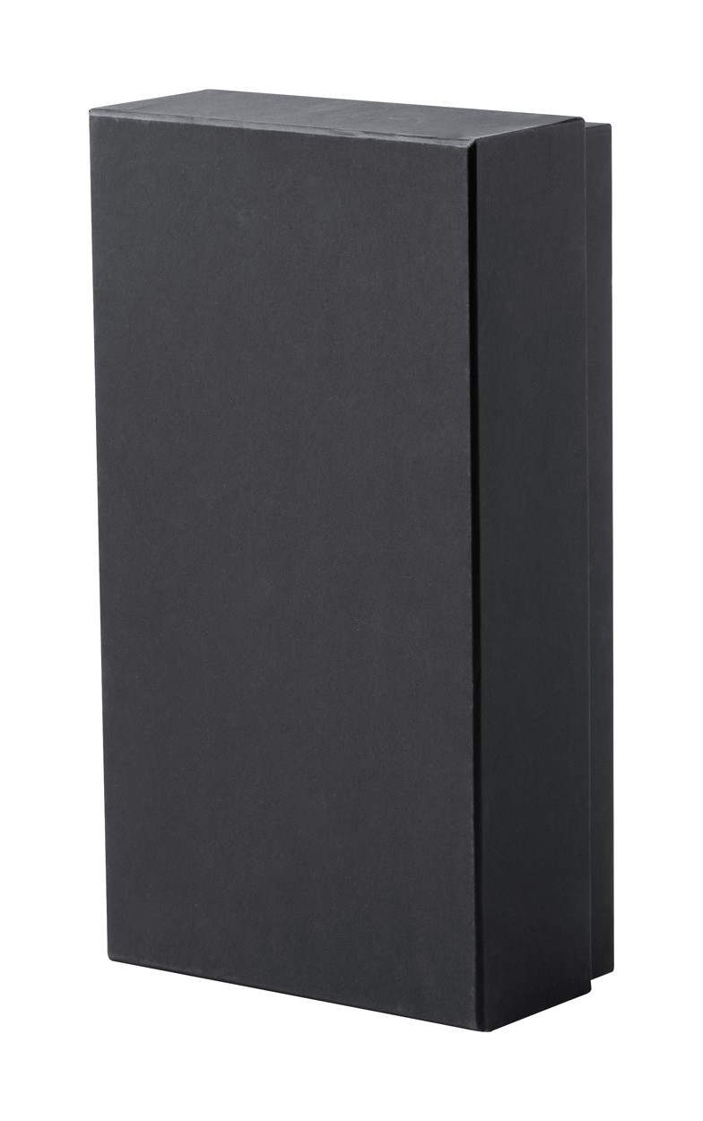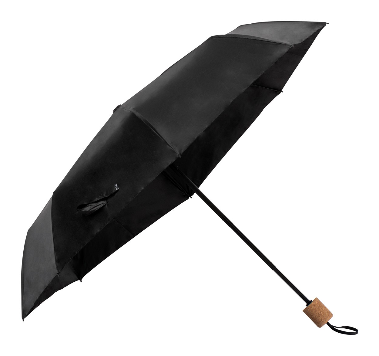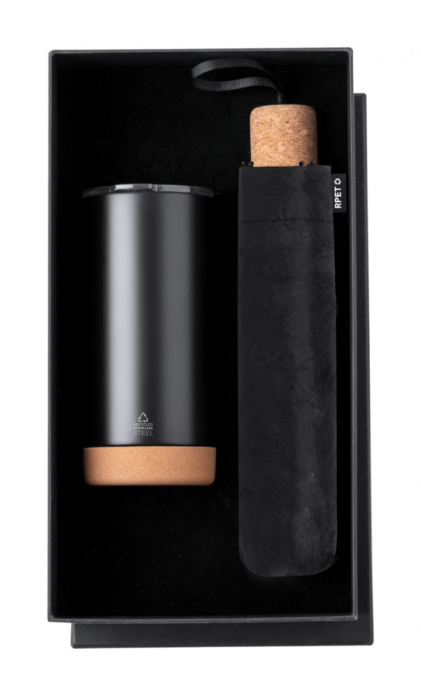 2 pc travel set in black gift box. Including 1 double-wall, recycled stainless steel thermo cup with natural cork base and drinking lid, 1 foldable, manual and windproof umbrella in 190T RPET pongee, with natural cork handle and fiberglass ribs.