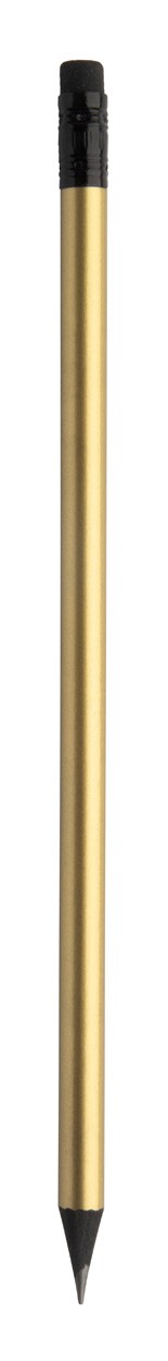 Creion negru din lemn, cu finisaj metalic, cu radieră neagră. Ascutit, grad HB.