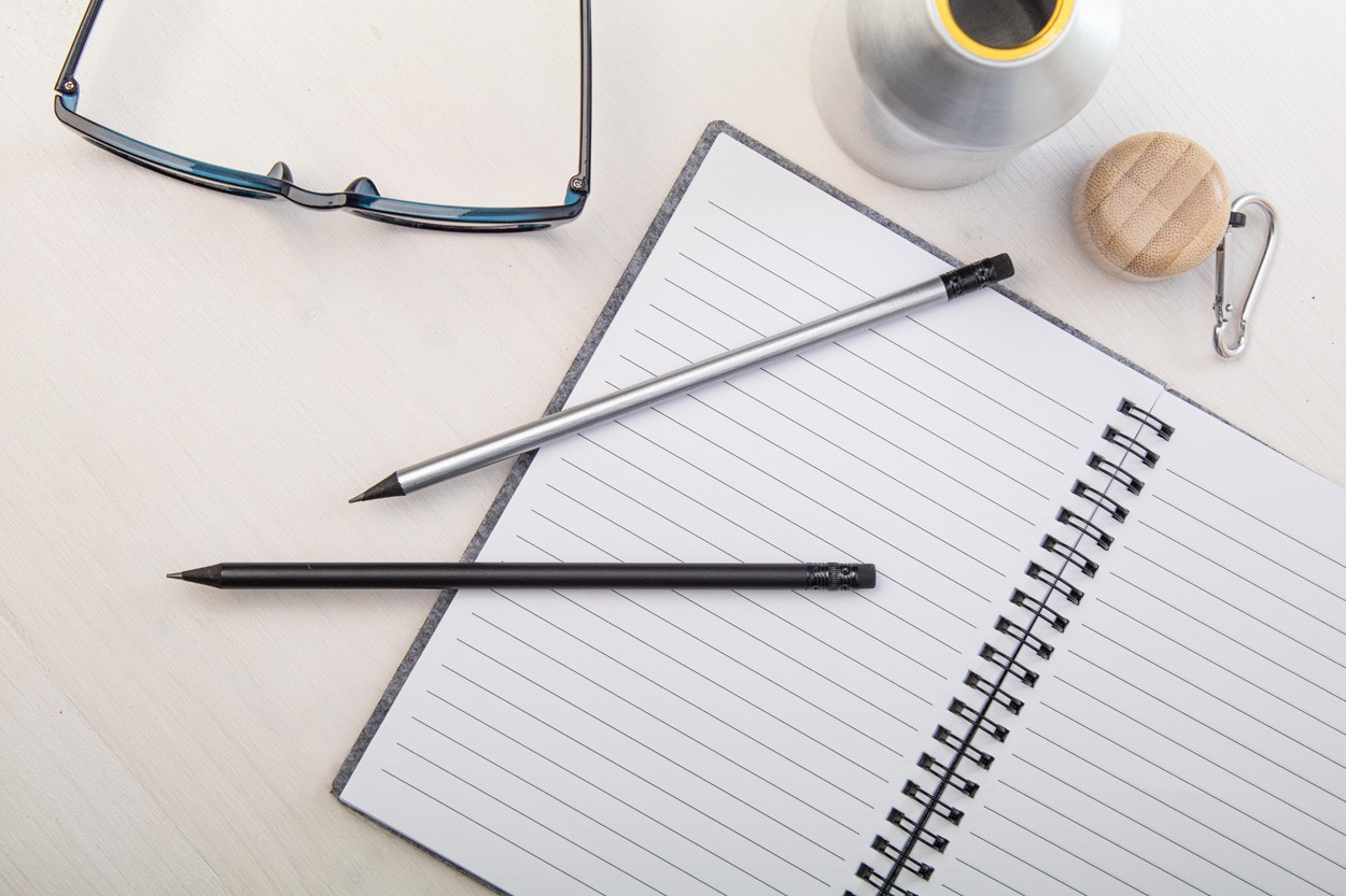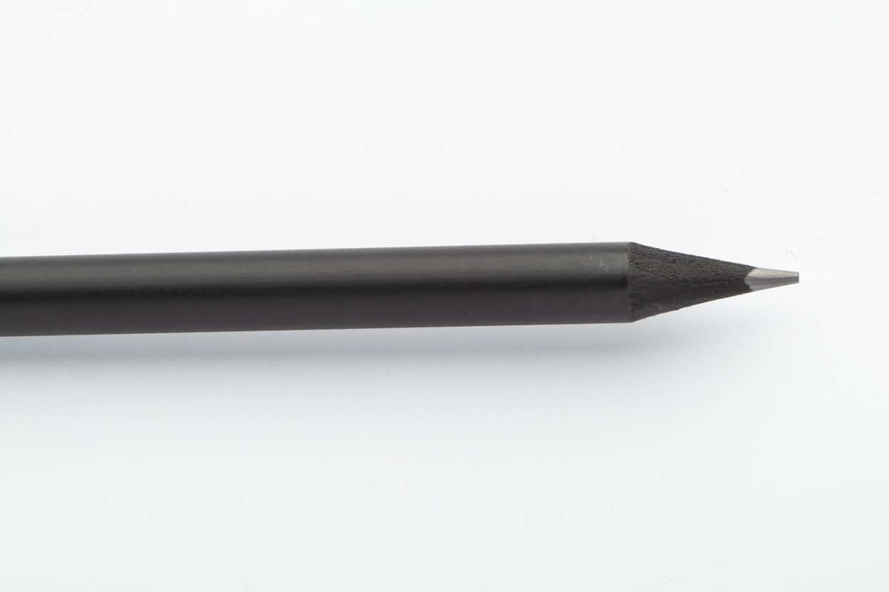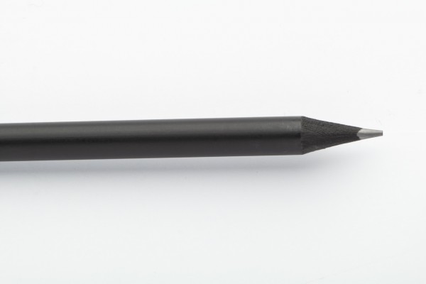 Creion negru din lemn, cu finisaj metalic, cu radieră neagră. Ascutit, grad HB.