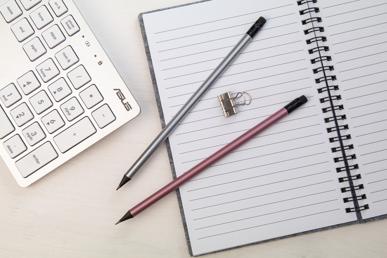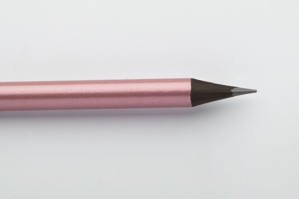Creion negru din lemn, cu finisaj metalic, cu radieră neagră. Ascutit, grad HB.