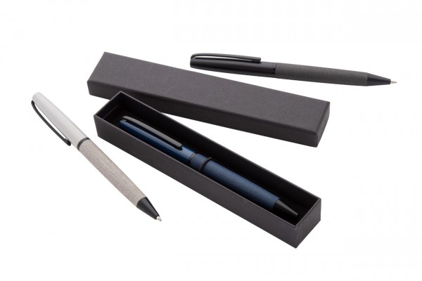 Pix metalic elegant, cu deschidere prin răsucire, cu corp acoperit cu piele PU și părți negre. În cutie cadou neagră. Cu mină albastră.