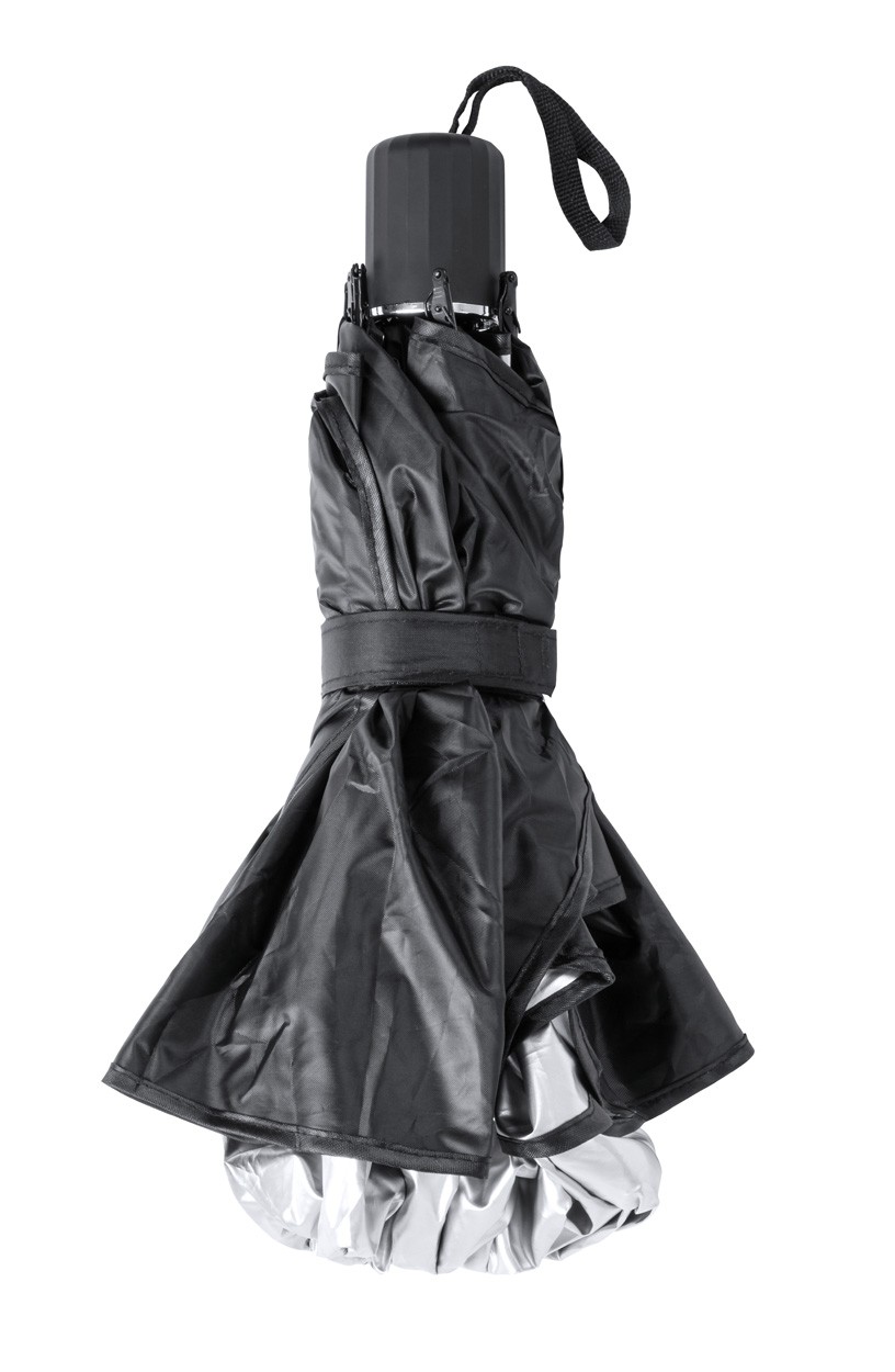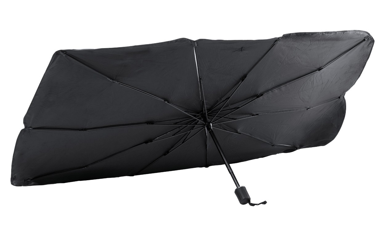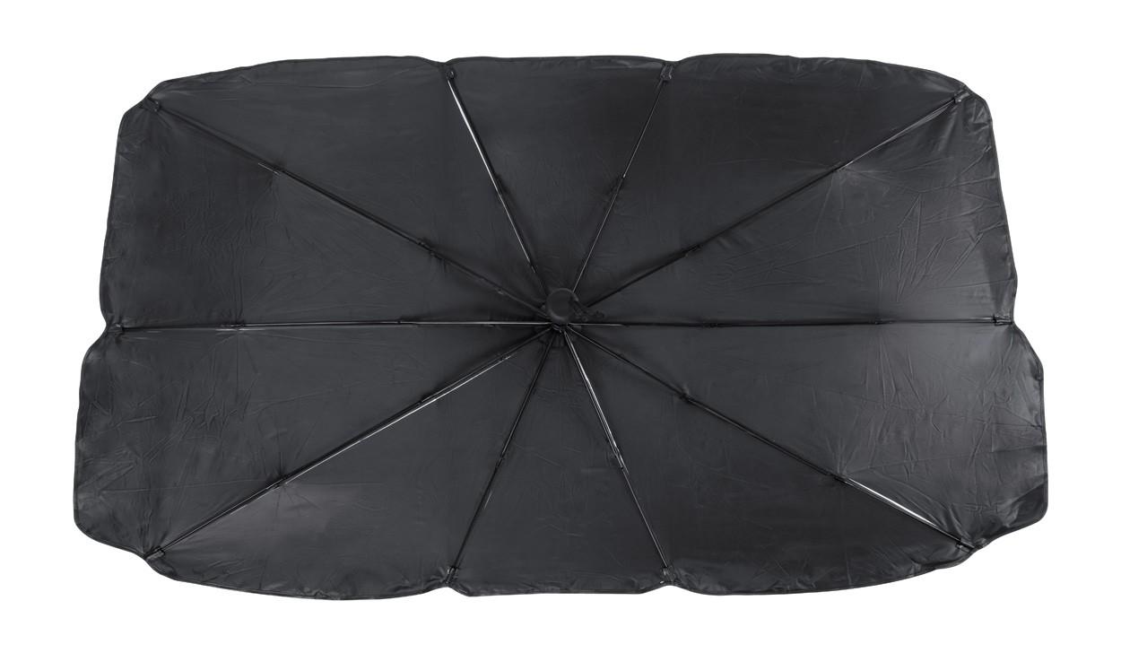 Umbrelă pliabilă de protecție solară auto pentru parbriz cu cadru metalic. În husă din poliester.
