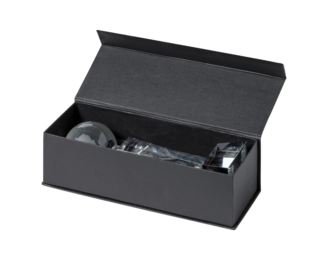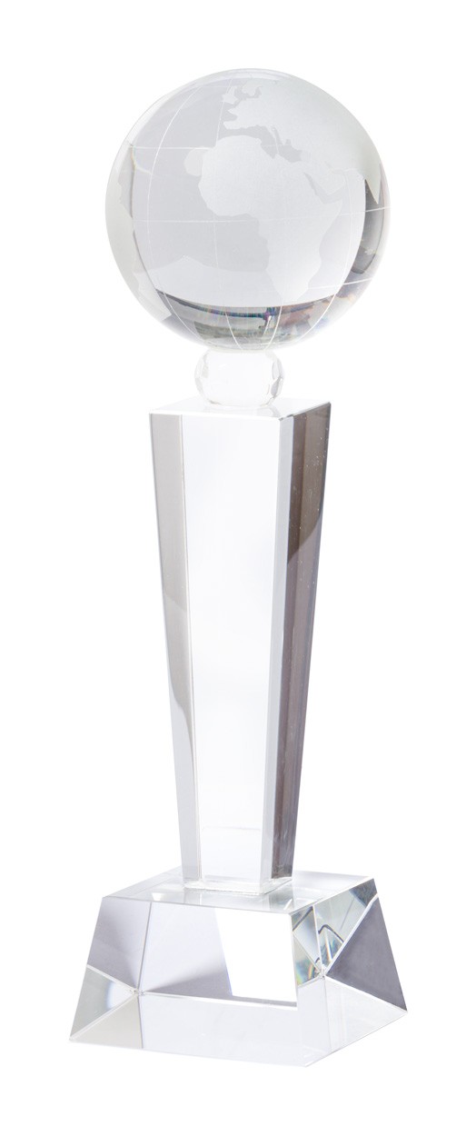 Trofeu din sticlă groasă cu detaliu în formă de glob. În cutie cadou neagră cu încuietoare magnetică.