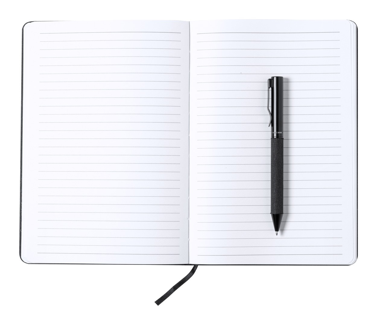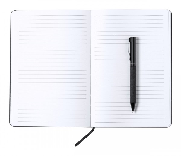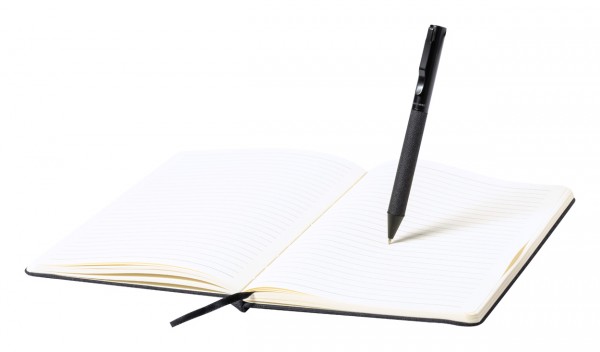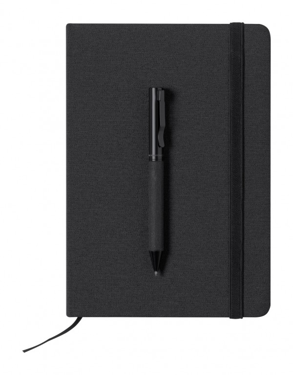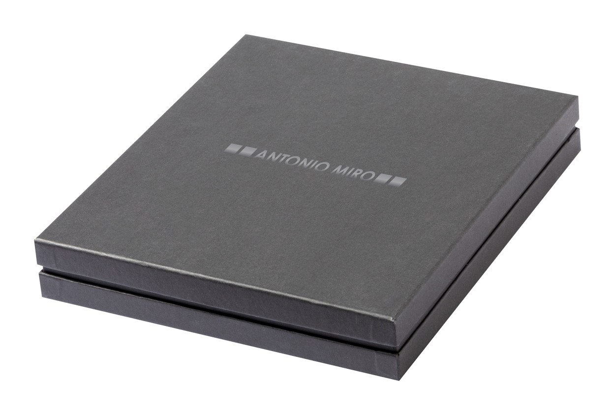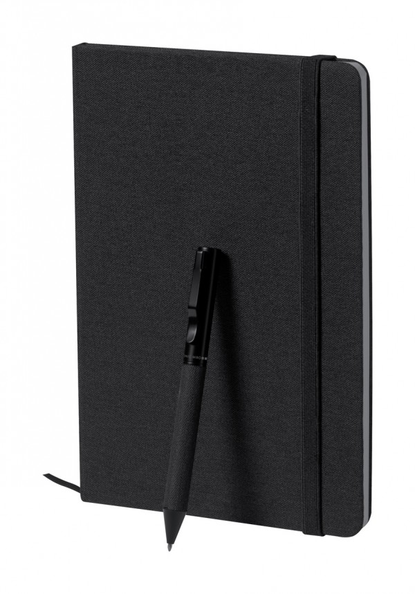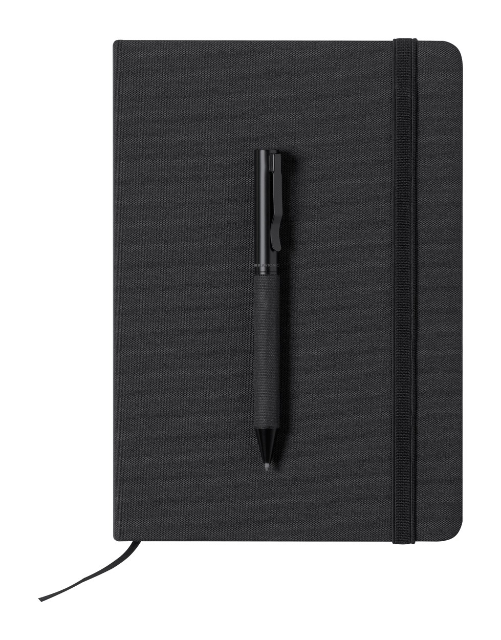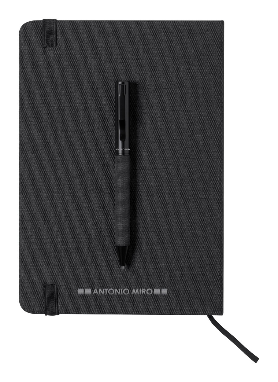 Agendă elegantă, acoperită cu poliester 300D, cu curea de cauciuc, marcaj și 100 de foi dictando. Cu un pix cu bilă metalic, cu mină albastră. În cutie cadou neagră. Produs marca Antonio Miro.