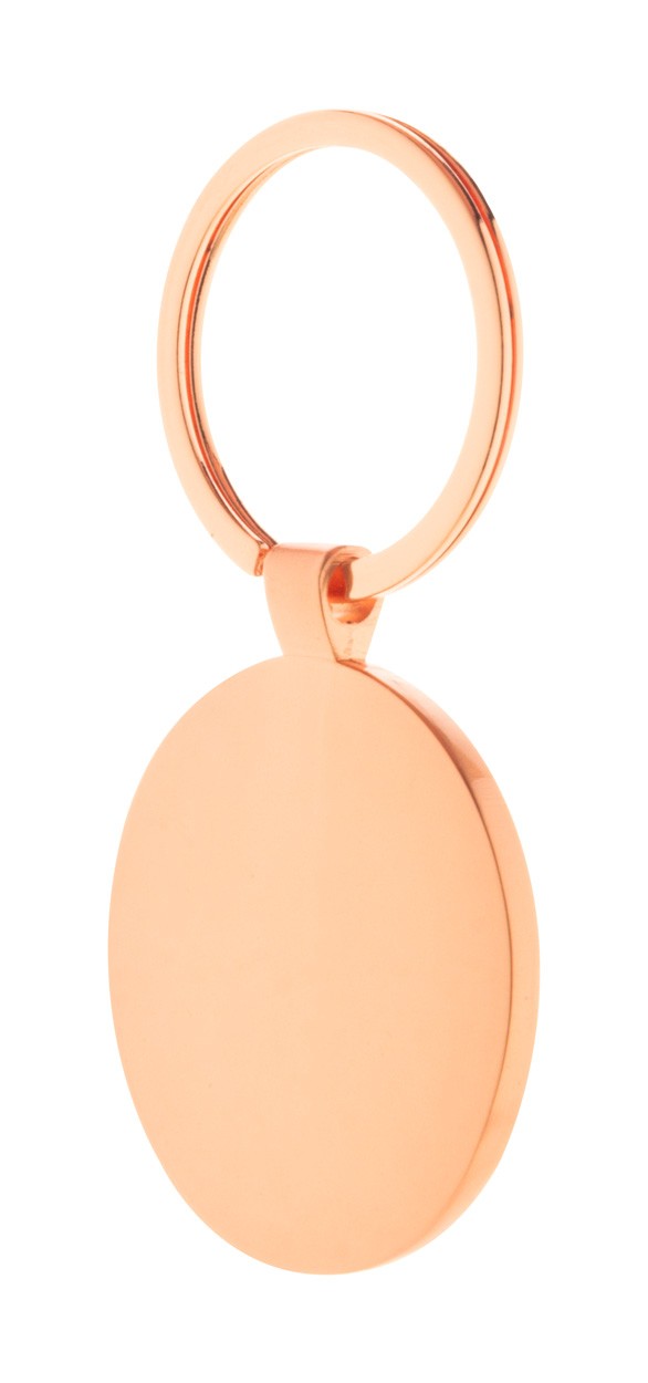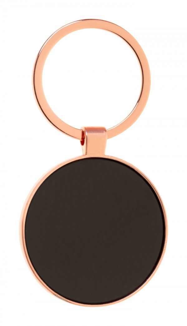 Breloc din metal, de formă rotundă, cu finisaj auriu, cu placă din metal. În cutie de hârtie kraft.