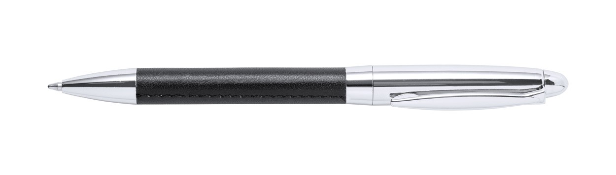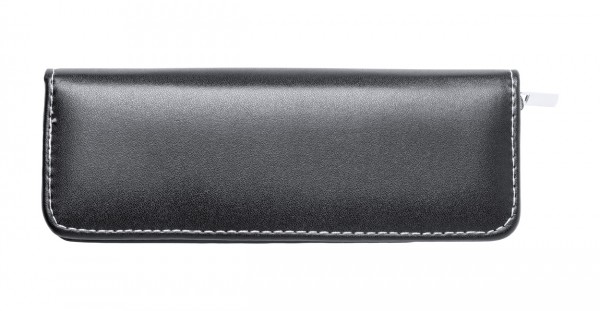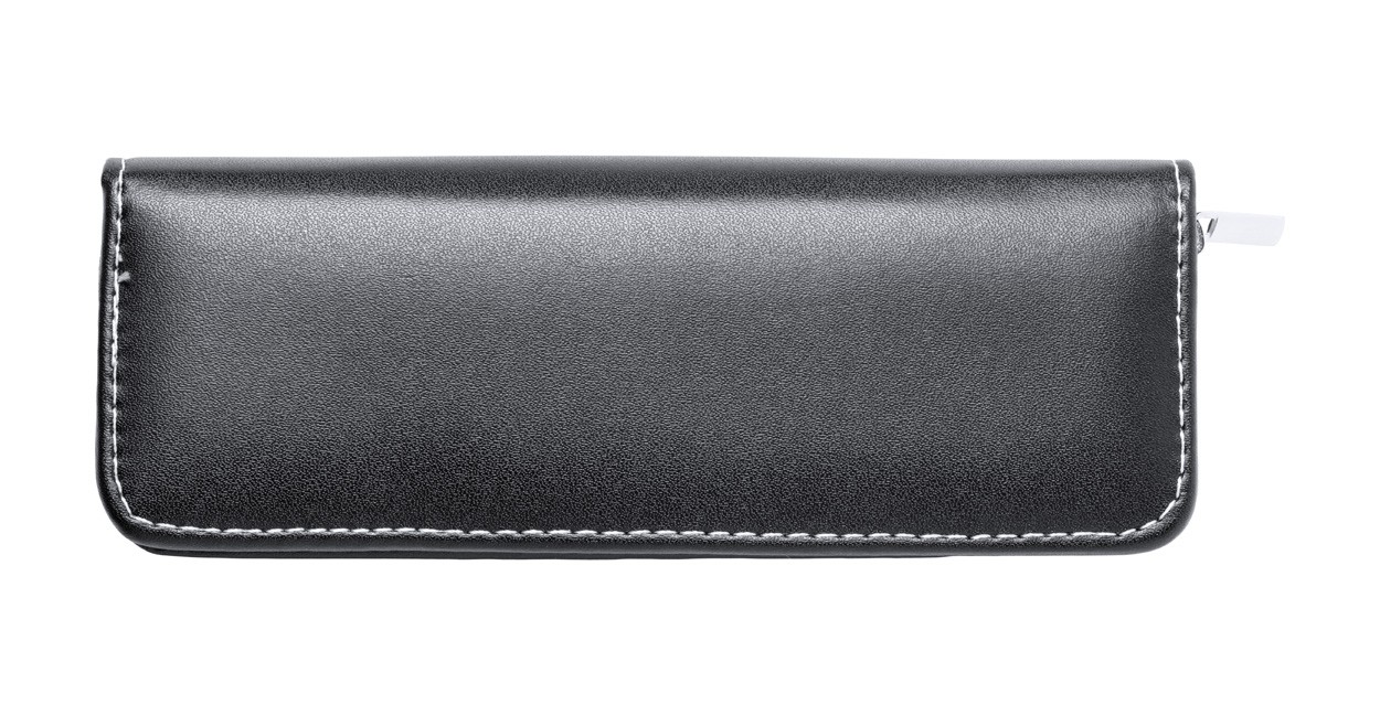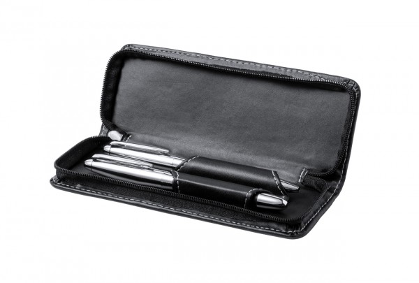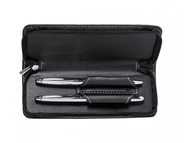 Set elegant de pixuri metalice cu pix și pix roller, acoperite cu piele PU. În husă din piele PU cu fermoar. Cu mina albastră.