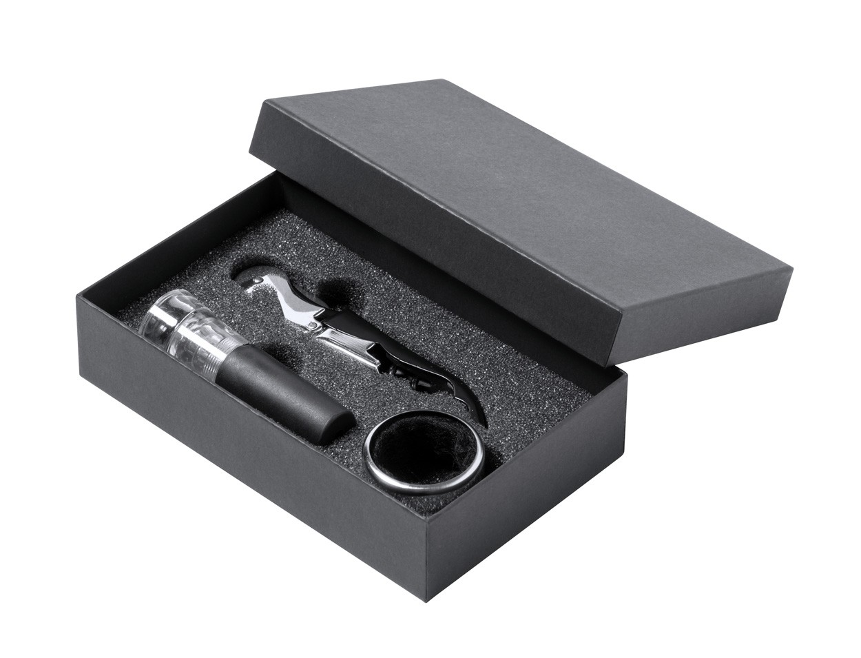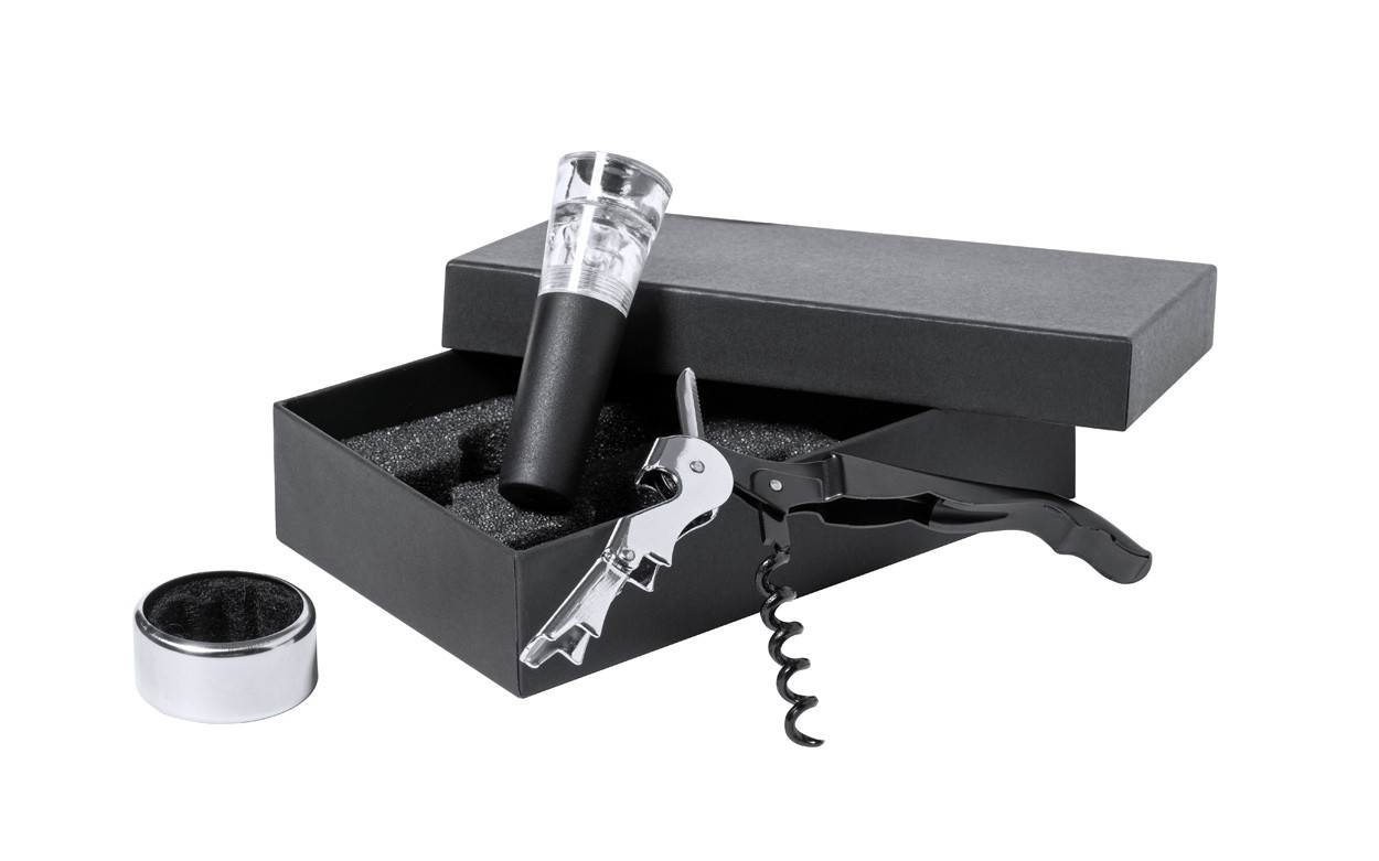 Set de vin cu tirbușon, dop de picătură și dop de vid. În cutie cadou neagră.