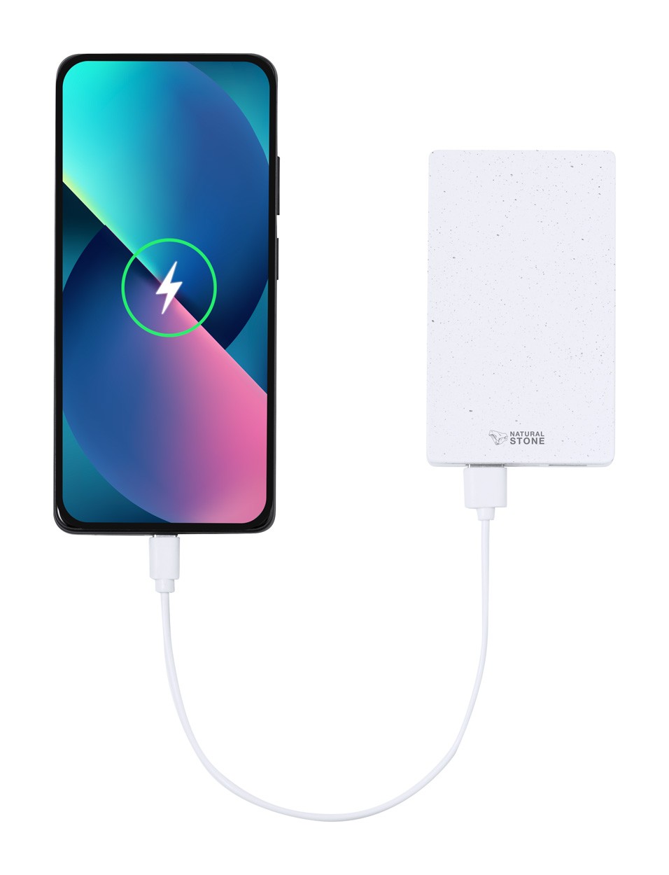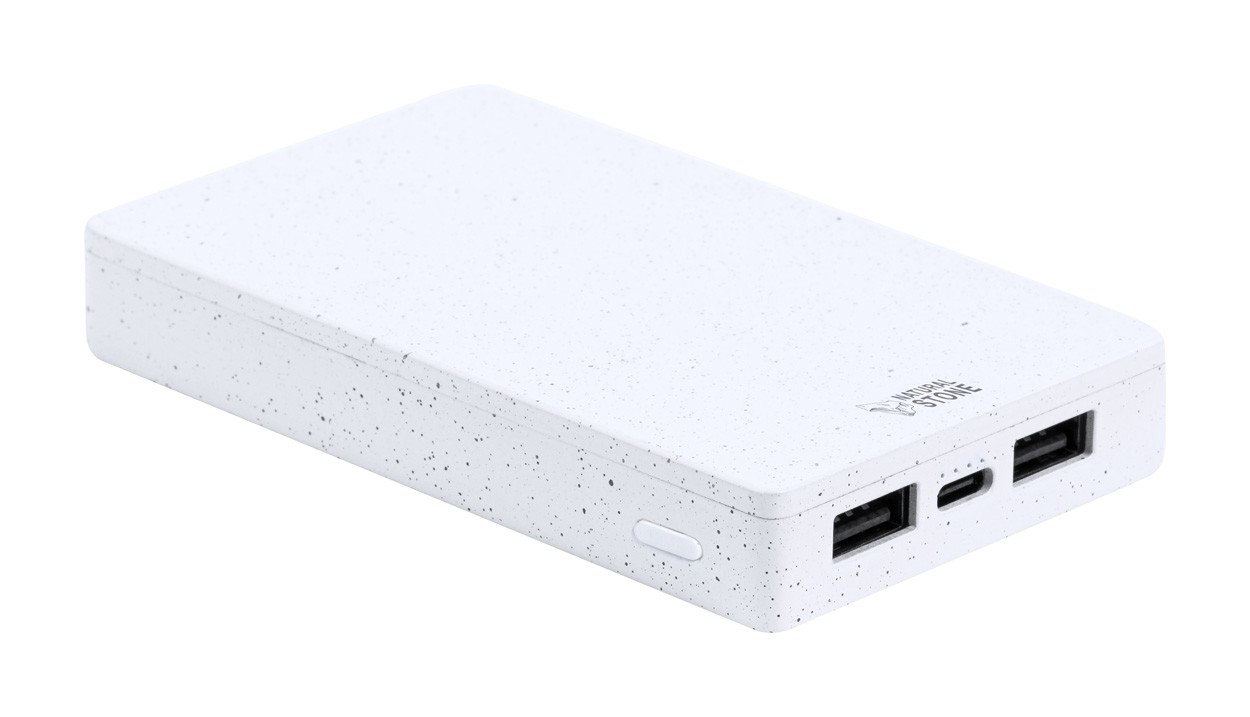 USB power bank in natural stone extract and ABS plastic. With 5000 mAh battery. Including USB charger cable.