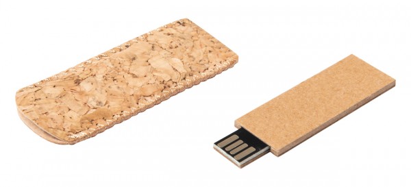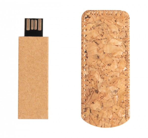 Memorie USB de 16GB din carton reciclat în husă din plută naturală. În cutie de hârtie kraft.