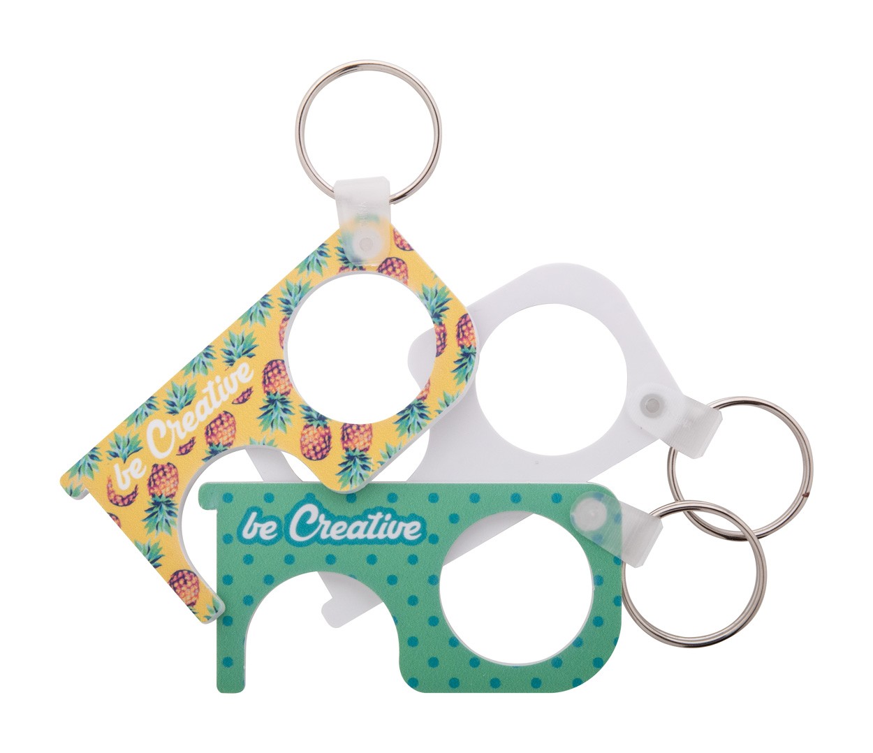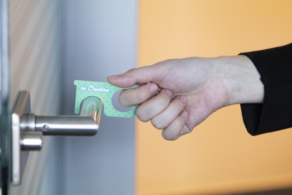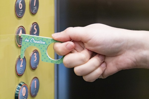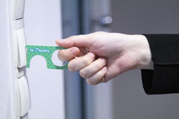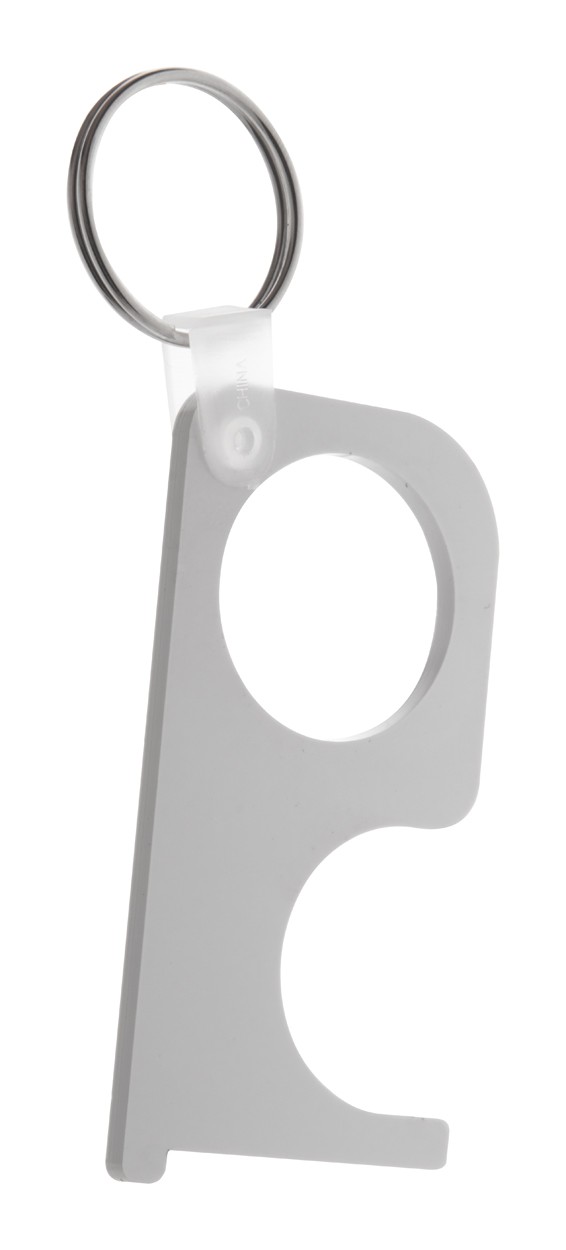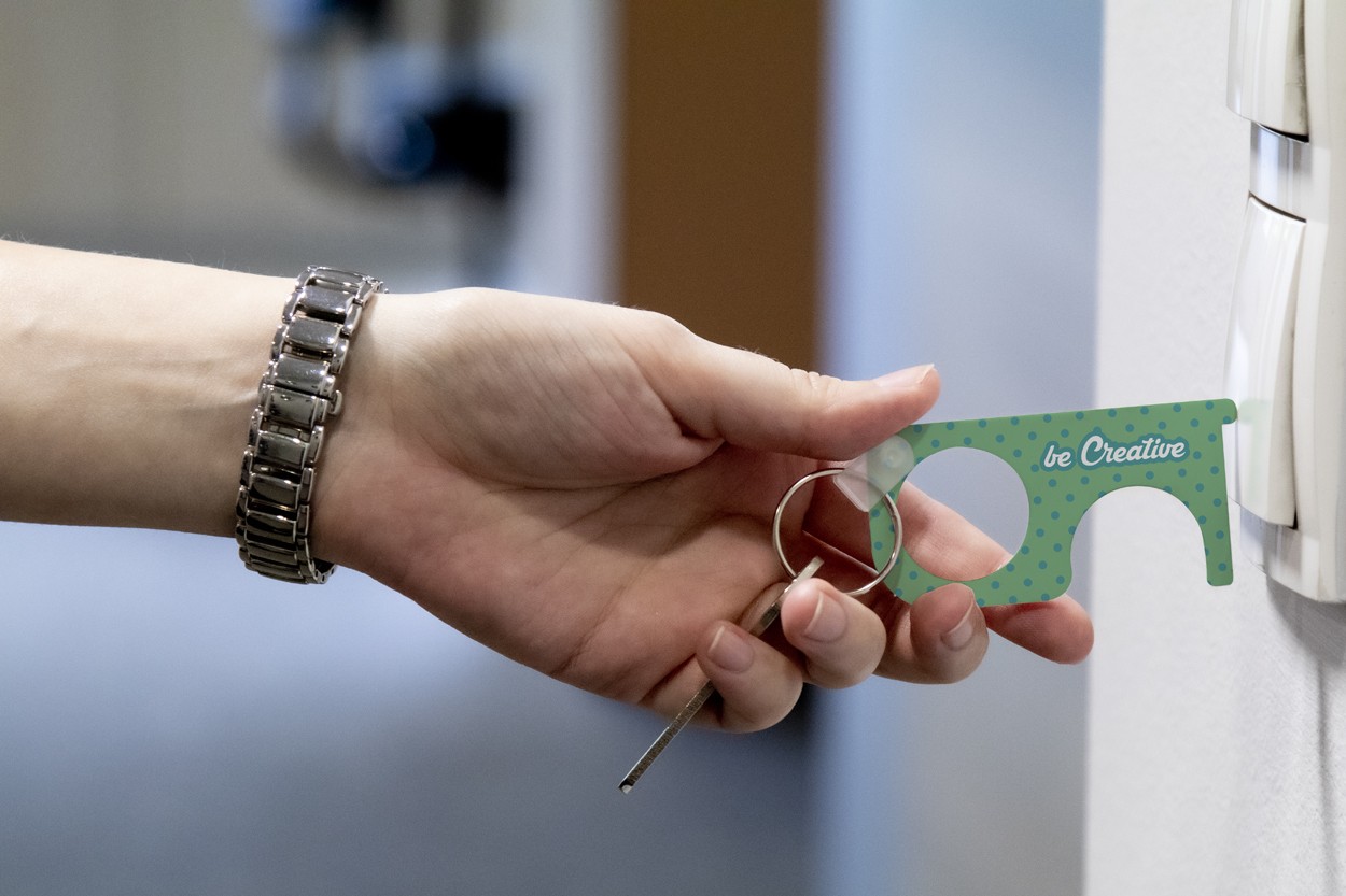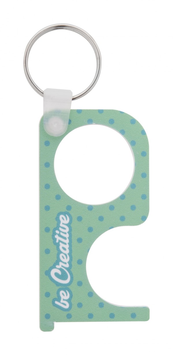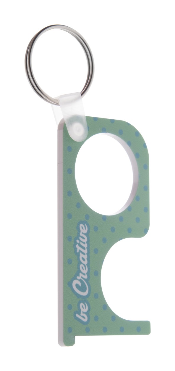 Cheie de igiena personalizata din material acrilic, cu inel metalic - pentru apasarea butoanelor si deschiderea usilor fara contact direct. Poate fi utilizata si ca un breloc. Pretul include imprimarea cu UV LED pe o parte. Cantitate minima de comanda: 250 buc.