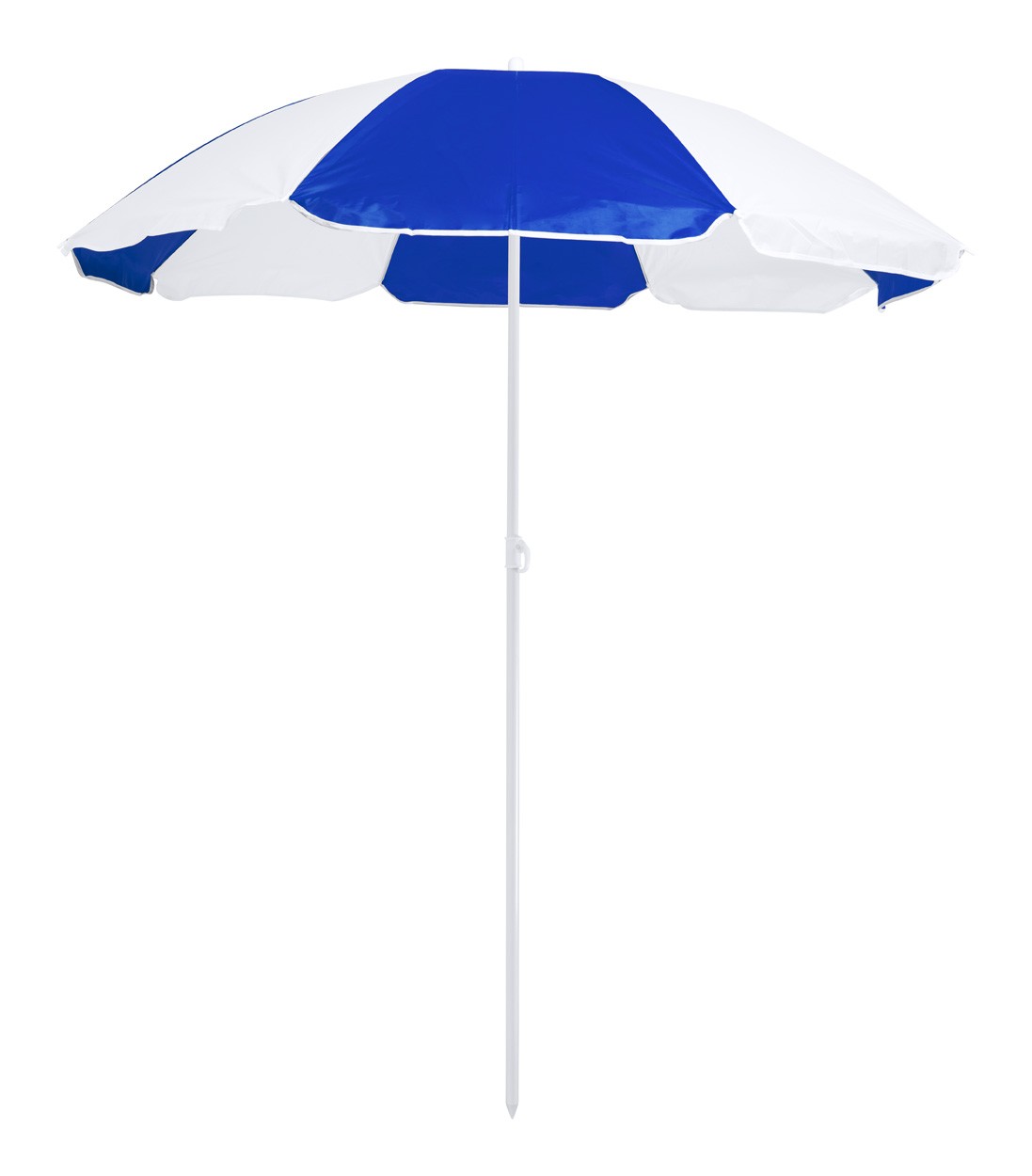 Umbrelă de plajă, bicoloră, cu cadru metalic reglabil pe înălțime și 8 panouri din nailon. Cu geantă de transport din PVC.