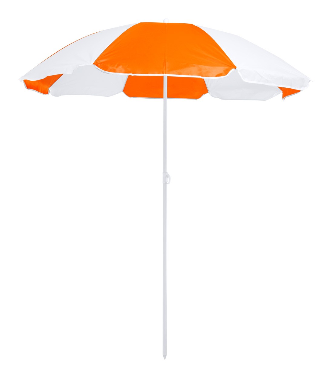 Umbrelă de plajă, bicoloră, cu cadru metalic reglabil pe înălțime și 8 panouri din nailon. Cu geantă de transport din PVC.