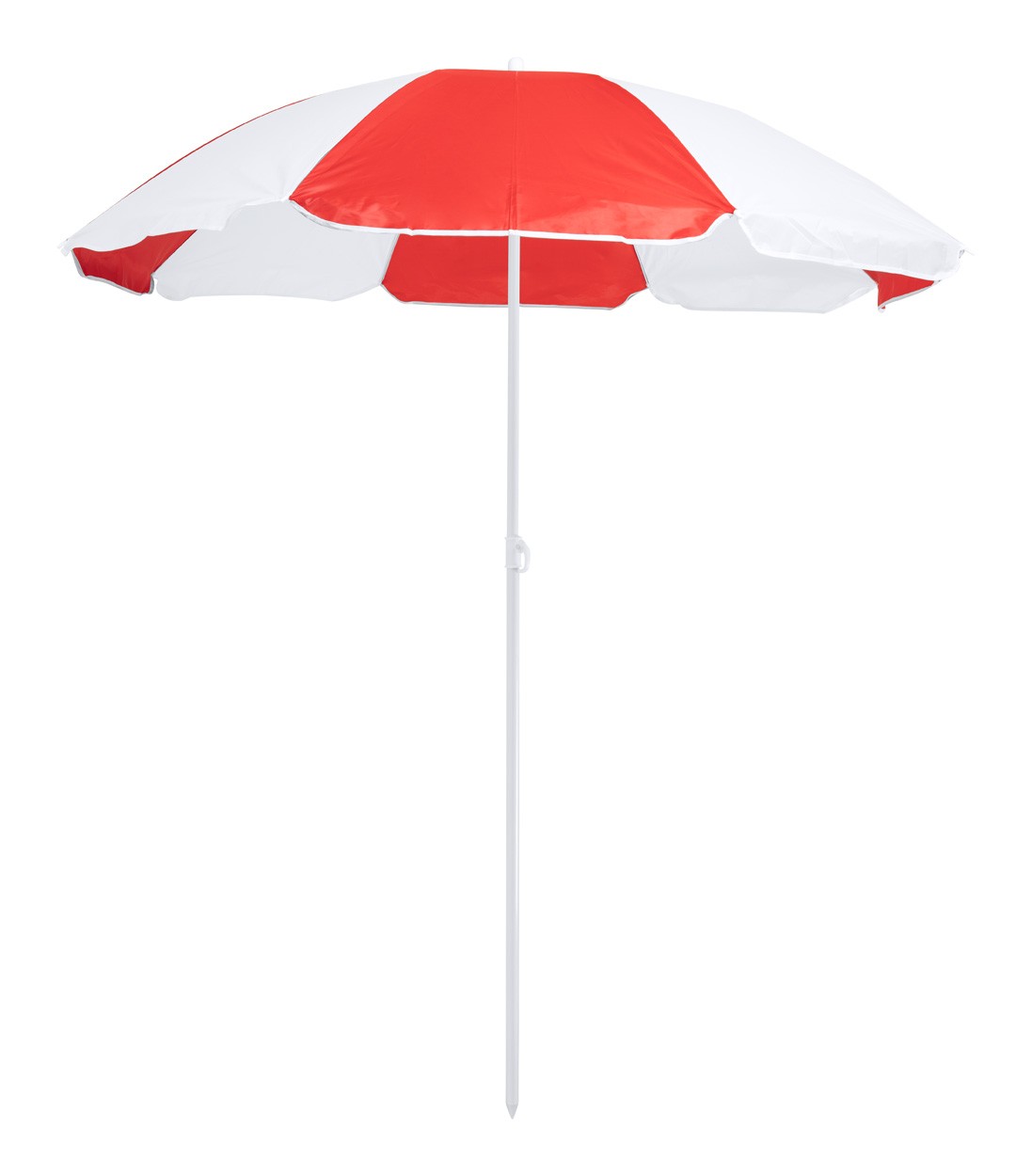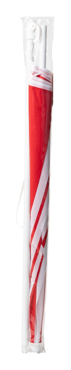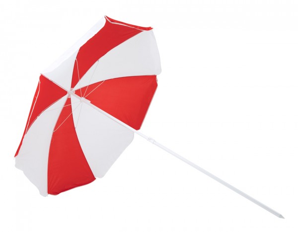 Umbrelă de plajă, bicoloră, cu cadru metalic reglabil pe înălțime și 8 panouri din nailon. Cu geantă de transport din PVC.
