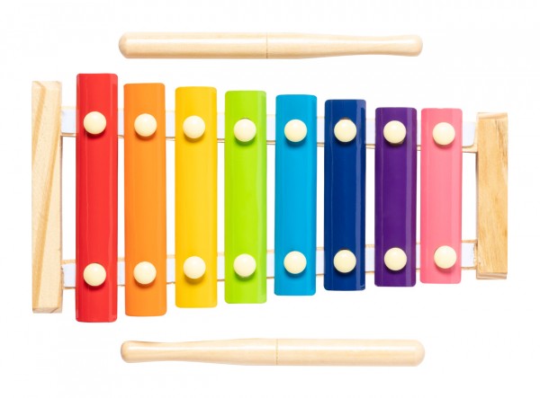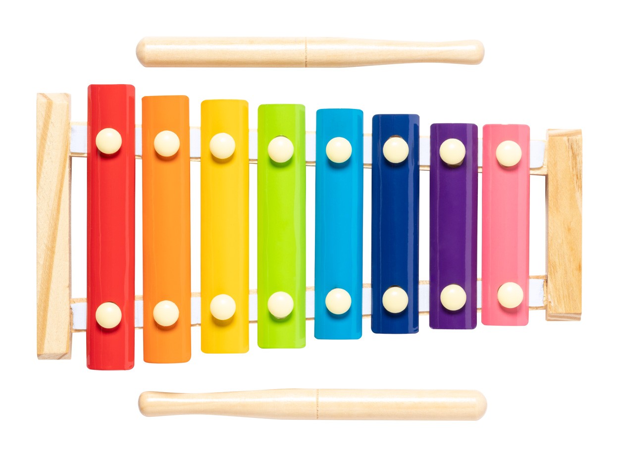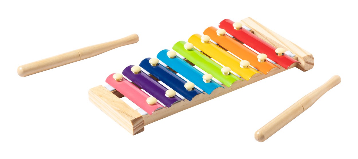 Xilofon din lemn cu bețișoare și chei metalice multicolore.