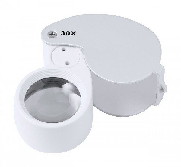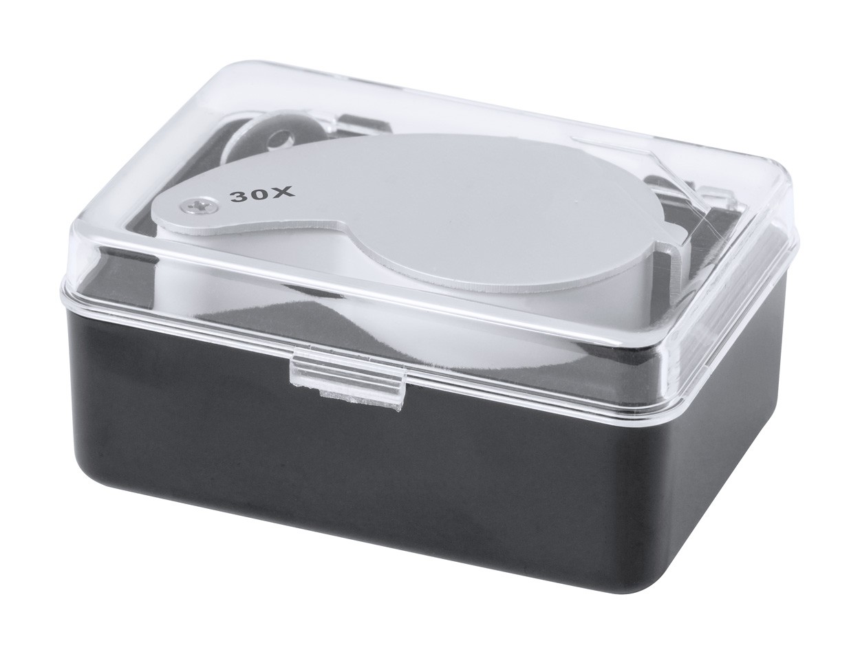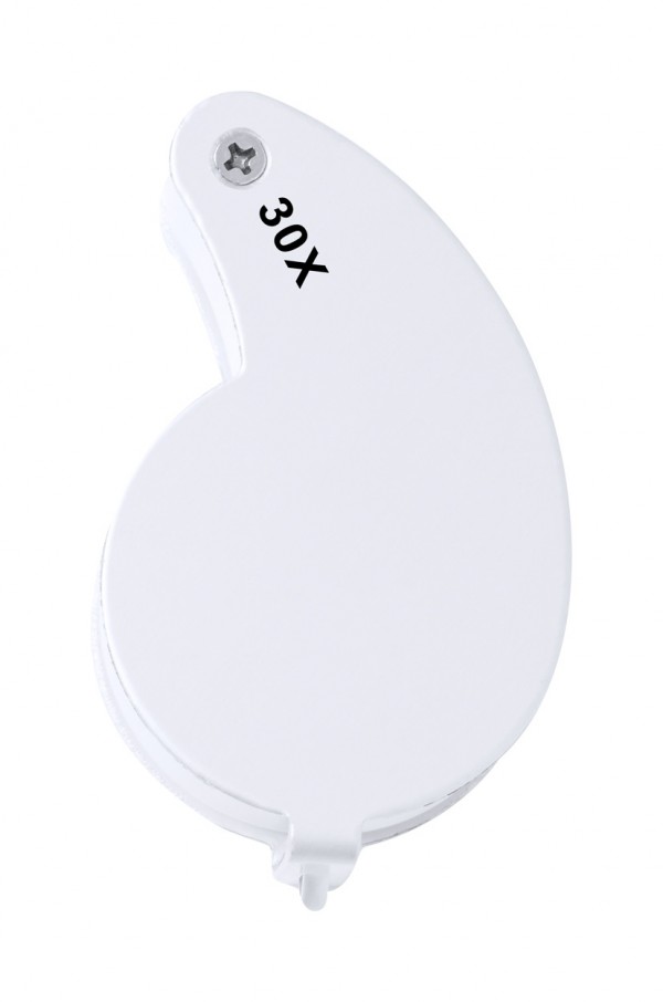 Foldable magnifier in ABS plastic and metal, with 2 LEDs. Including button cell batteries.
