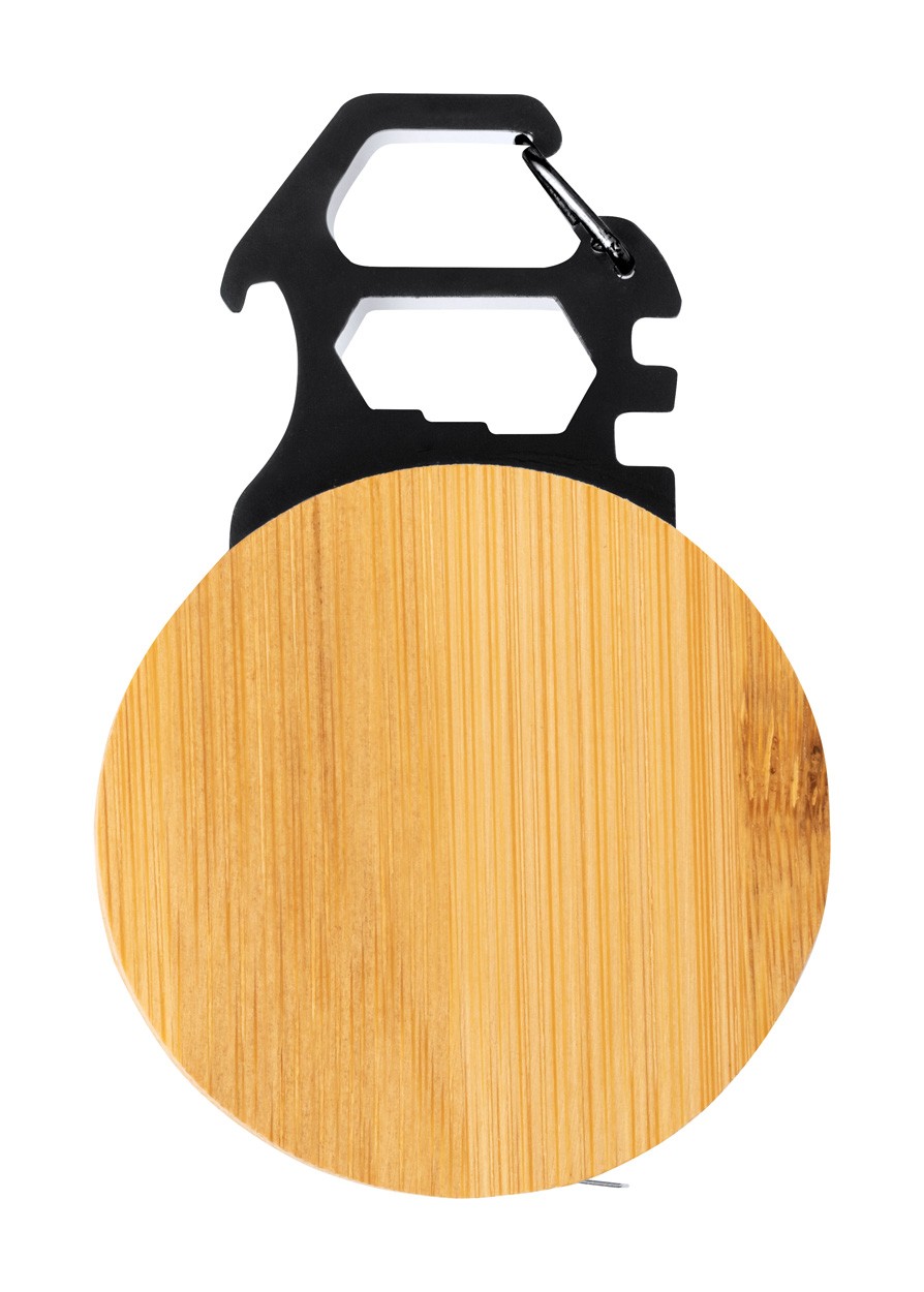 Instrument multiplu din bambus și oțel inoxidabil negru, cu bandă de măsurare de 1 m, deschizător de sticle, 5 chei hexagonale și carabină.