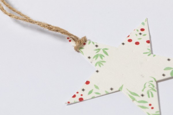 Ornament pentru brad, din hârtie de semințe, cu sfoară de iută. Coperta din hârtie conține semințe de petunia în culori asortate, care pot fi plantate prin desprinderea de șnur.