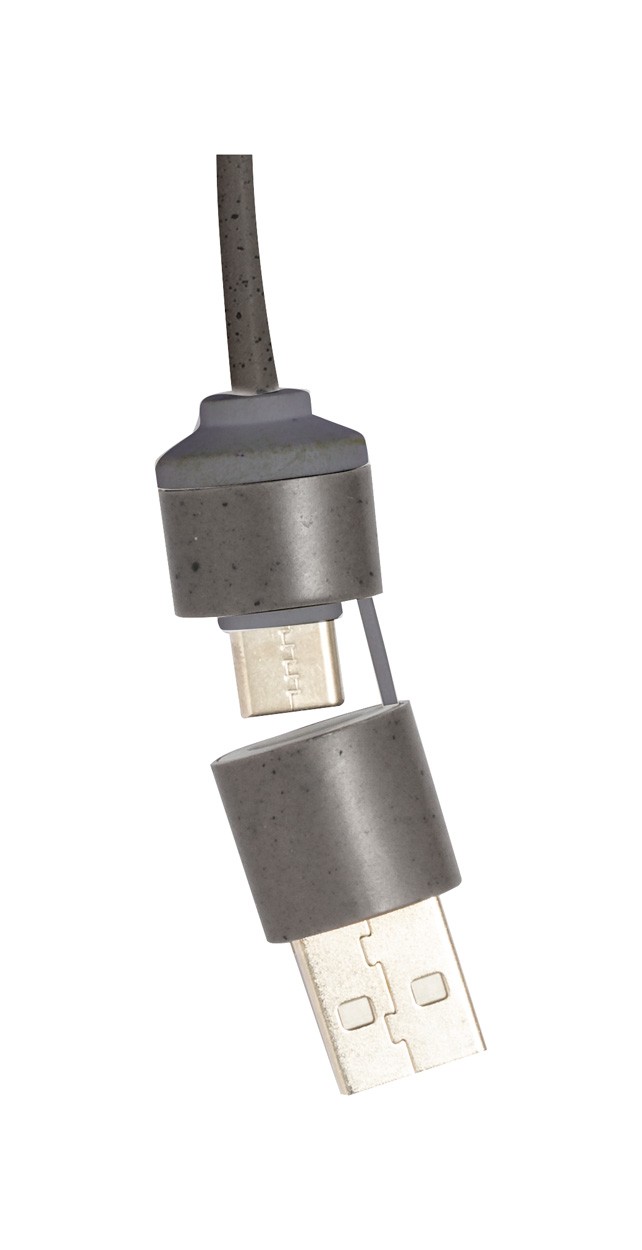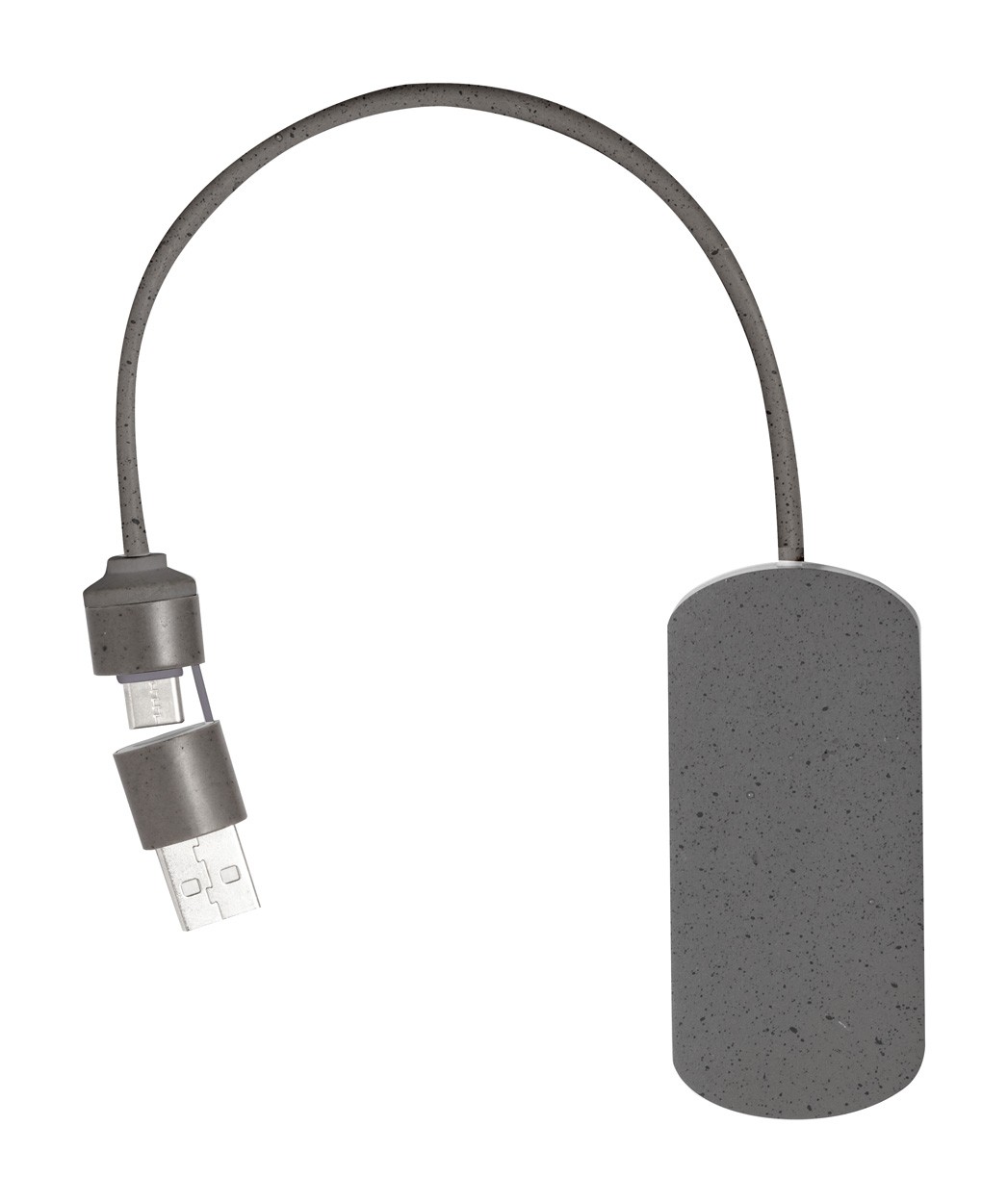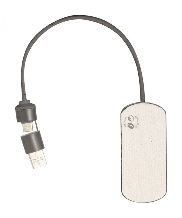 USB hub in coffee fibre plastic and recycled cotton. With 2 USB and 1 USB-C ports, USB 2.0. Including cable with USB and USB-C connections.
