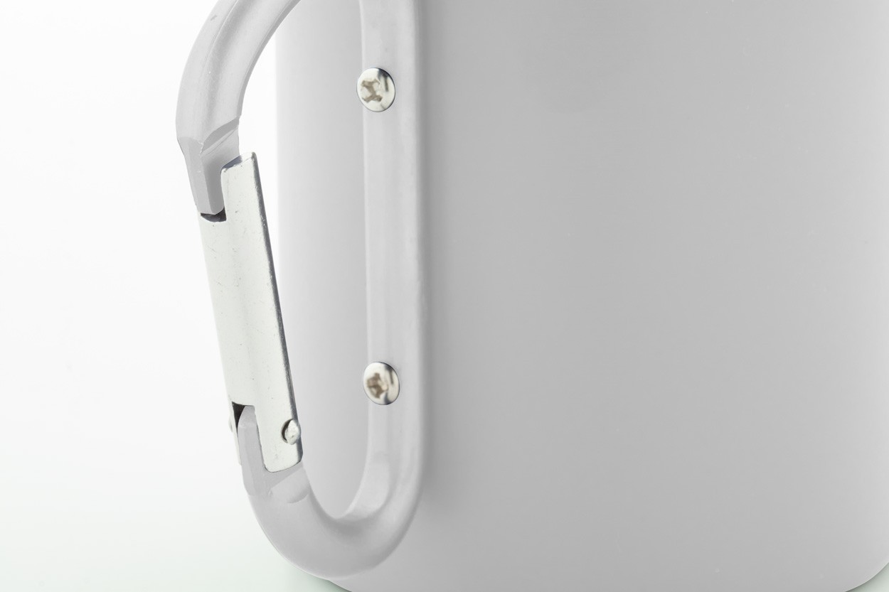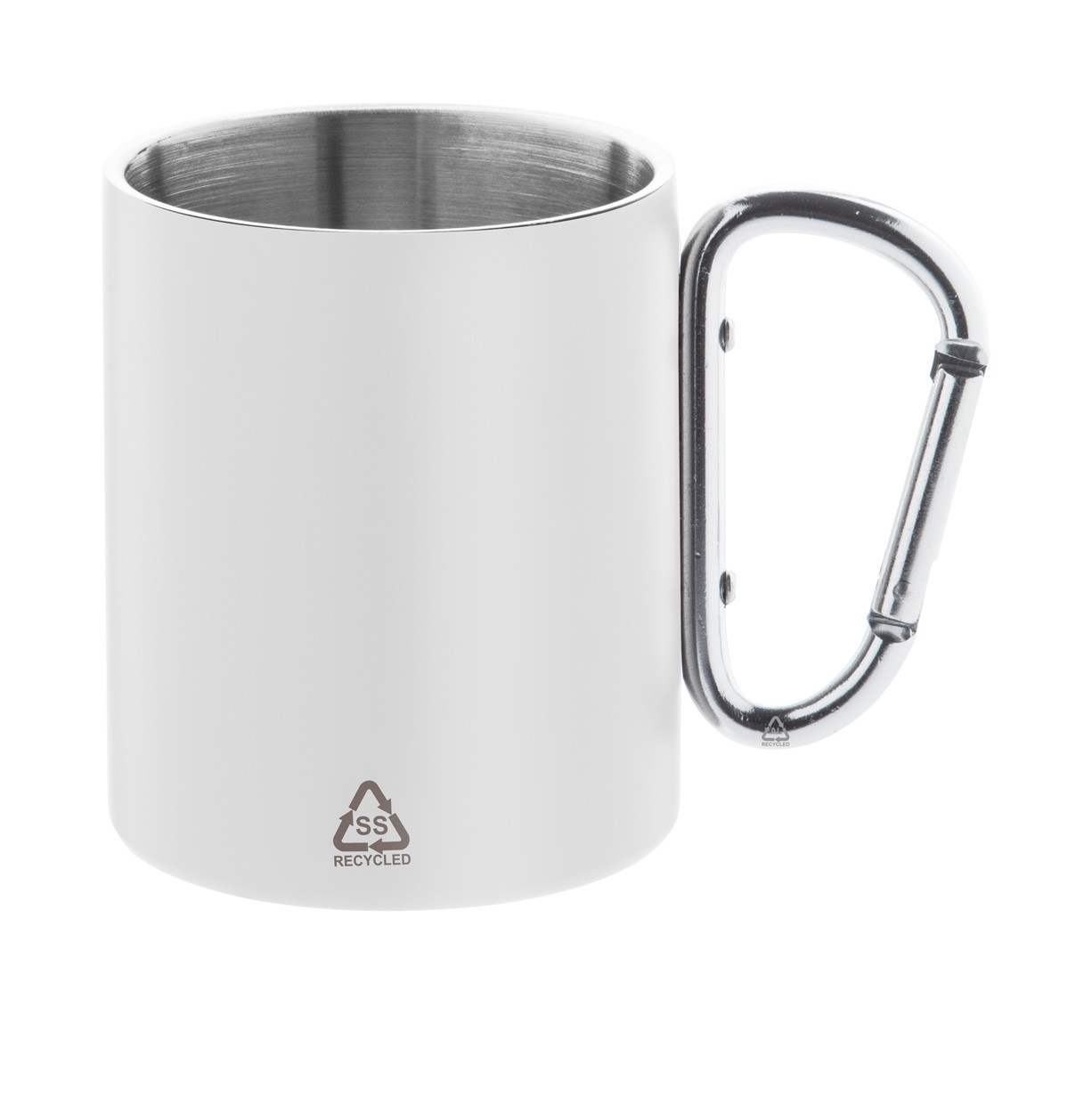 Cană termică din oțel inoxidabil reciclat, cu perete dublu, cu mâner pentru carabină, din aluminiu reciclat, de culoare asortată. 300 ml. În cutie de hârtie kraft.