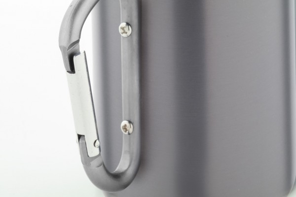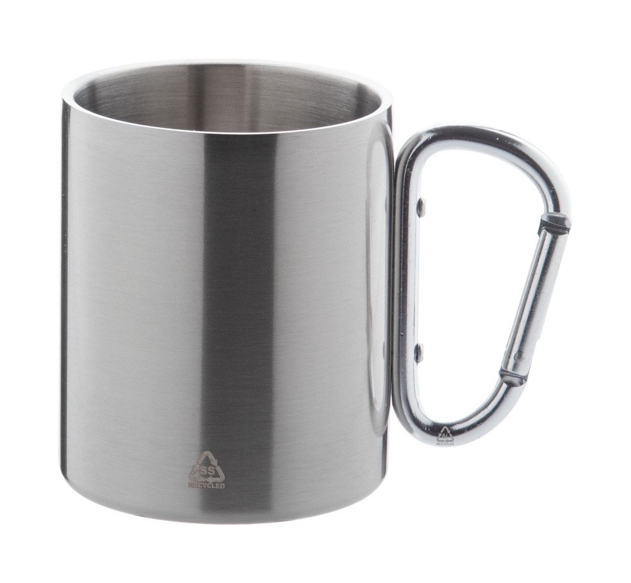 Cană termică din oțel inoxidabil reciclat, cu perete dublu, cu mâner pentru carabină, din aluminiu reciclat, de culoare asortată. 300 ml. În cutie de hârtie kraft.