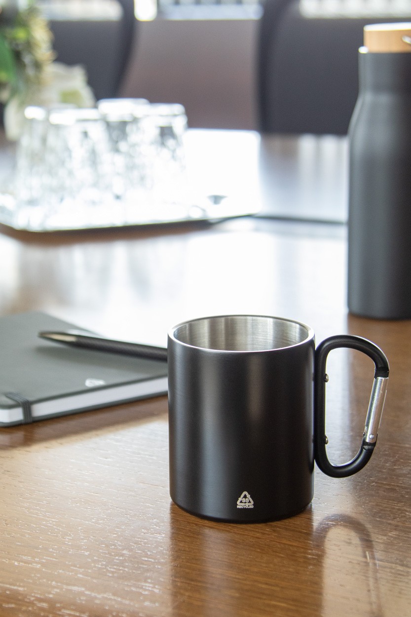 Cană termică din oțel inoxidabil reciclat, cu perete dublu, cu mâner pentru carabină, din aluminiu reciclat, de culoare asortată. 300 ml. În cutie de hârtie kraft.