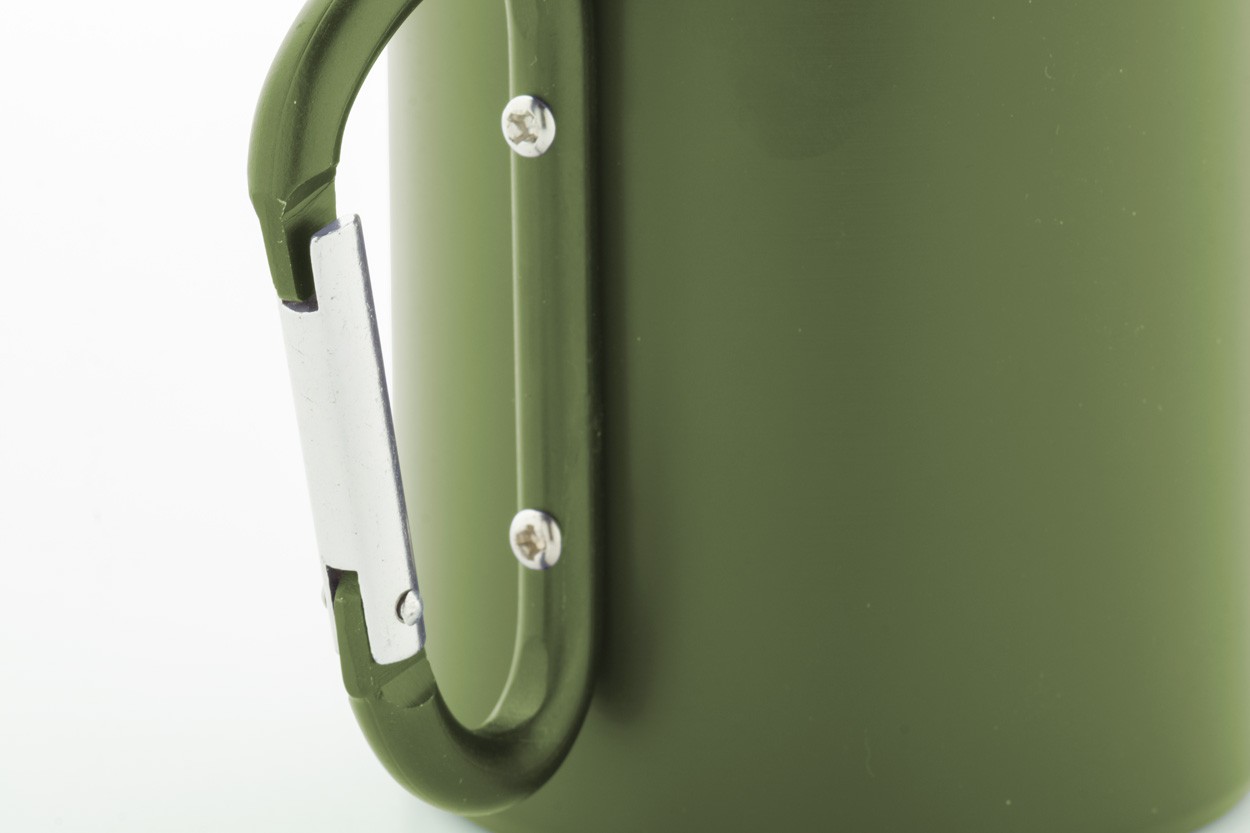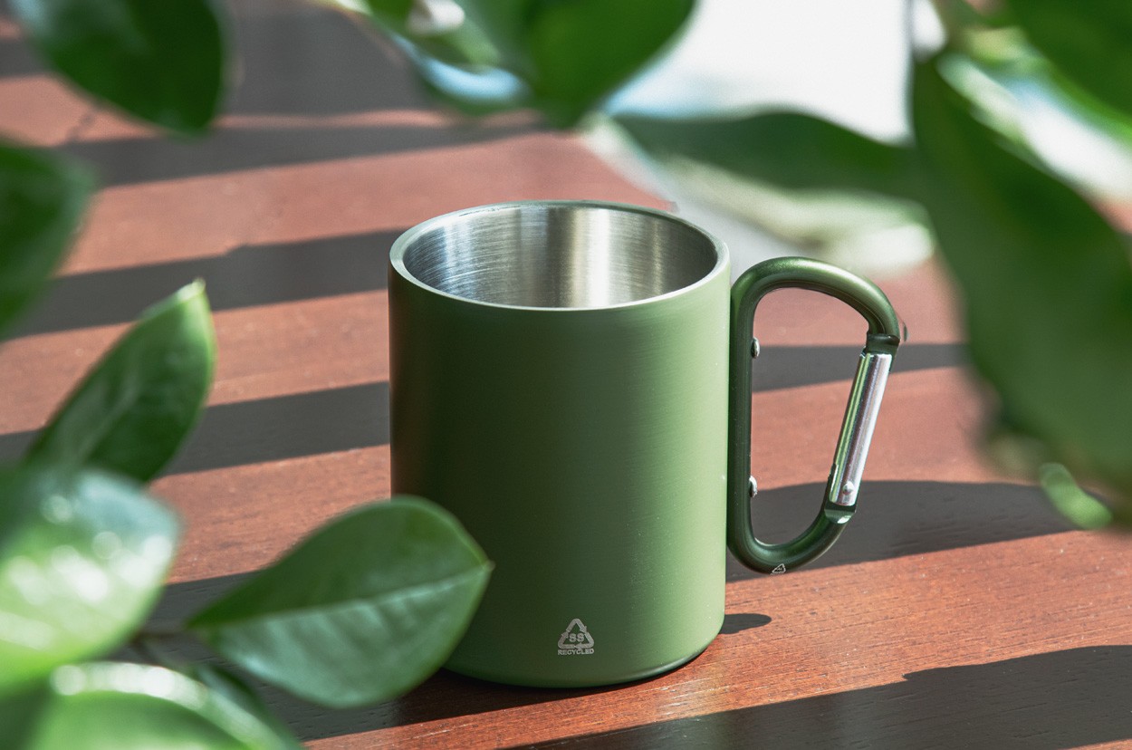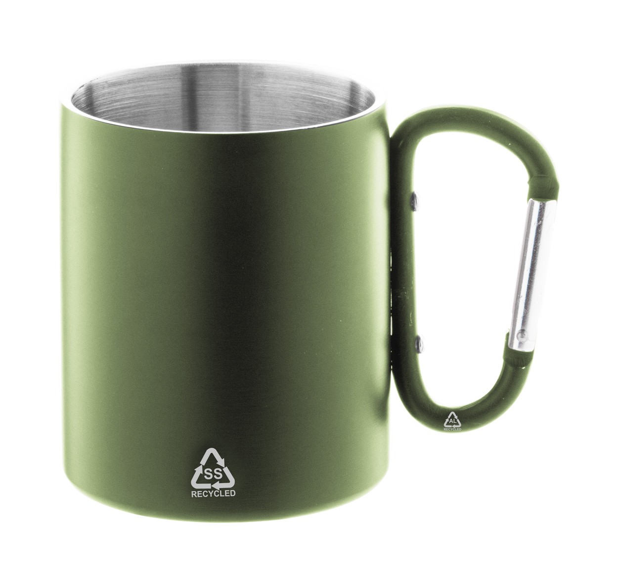 Cană termică din oțel inoxidabil reciclat, cu perete dublu, cu mâner pentru carabină, din aluminiu reciclat, de culoare asortată. 300 ml. În cutie de hârtie kraft.