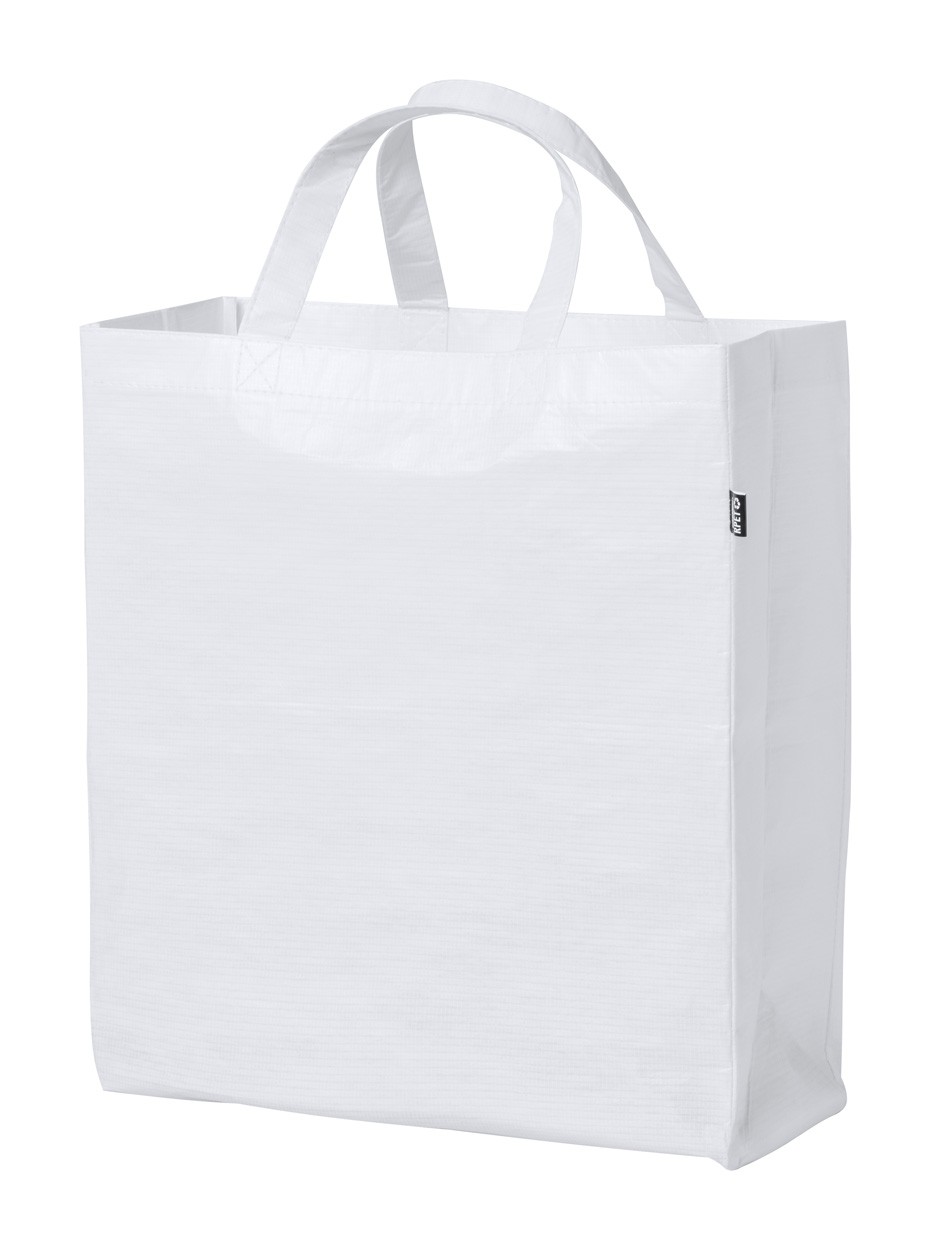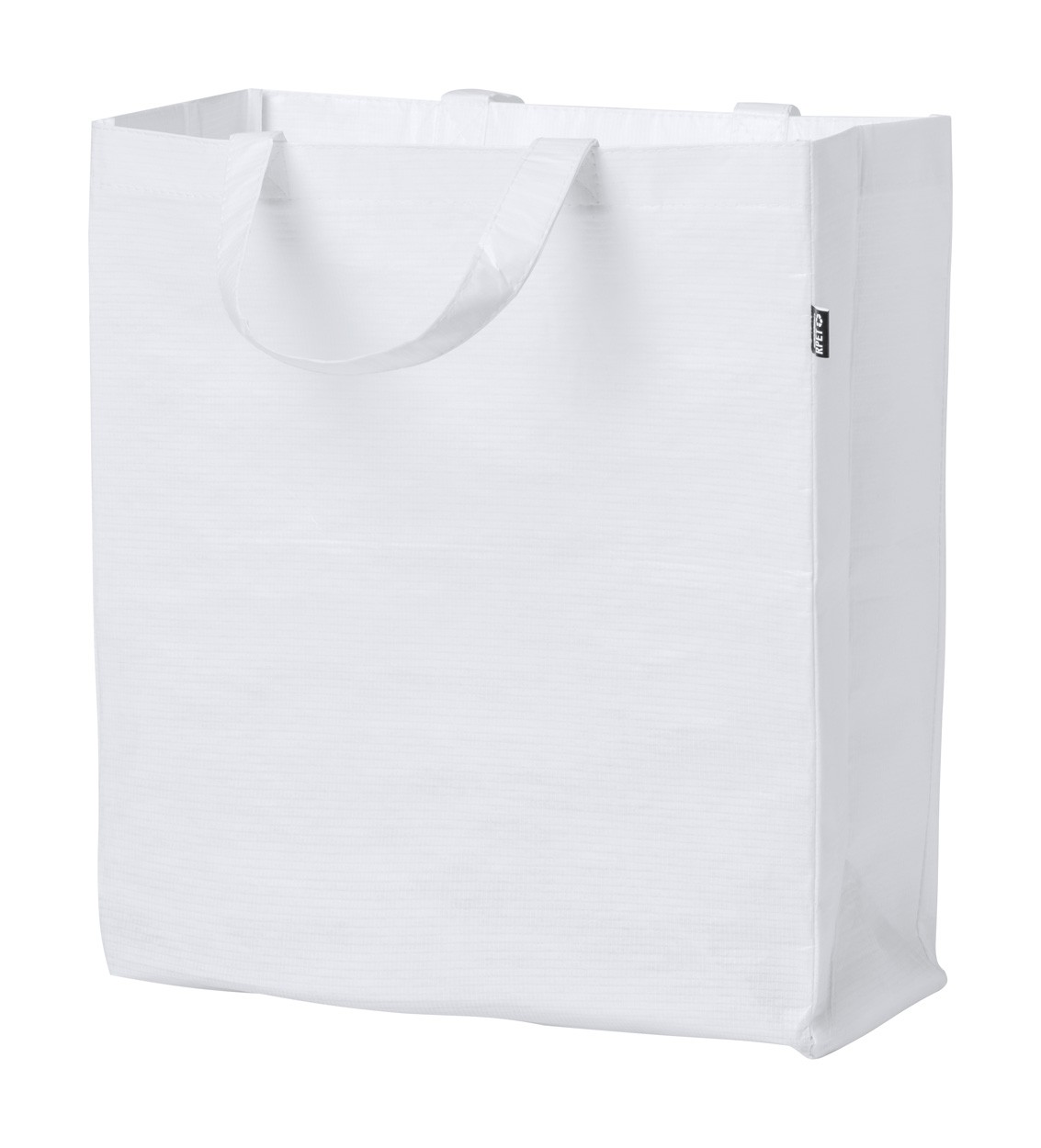 Geantă de cumpărături, din poliester RPET laminat, cu burduf și mânere scurte, 110 g/m². Cu etichetă distinctivă RPET.