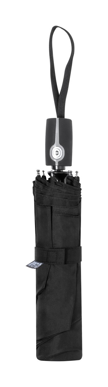 Umbrelă pliabilă, complet automată (deschidere/închidere), rezistentă la vânt, cu 8 panouri, în husă de culoare asortată. Cu cadru metalic, nervuri din fibră de sticlă și mâner din plastic. Pongee 190T RPET. Cu etichetă distinctivă RPET.