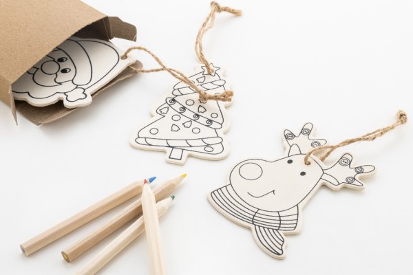 Set de ornamente de Crăciun, de colorat, în cutie de hârtie kraft, cu brad de Crăciun decupat. Include 3 ornamente din lemn cu șnur de cânepă și 4 creioane colorate.