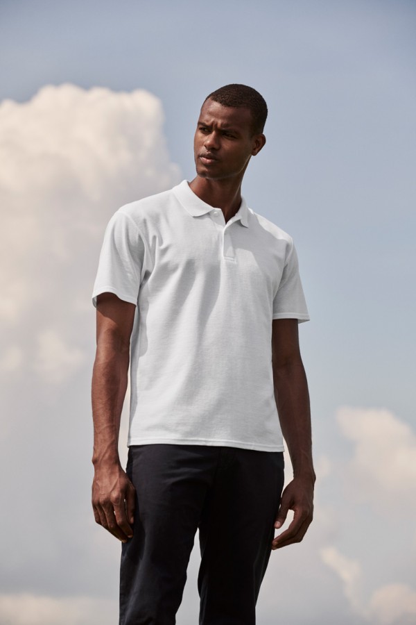 Tricou polo, pentru adulți, de culoare albă, cu 2 nasturi asortați. 100% bumbac piqué, 175 g/m². Produs marca Fruit of the Loom.