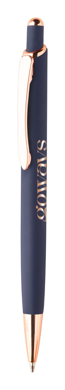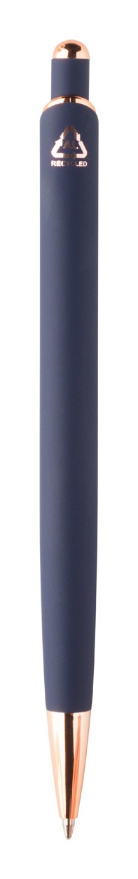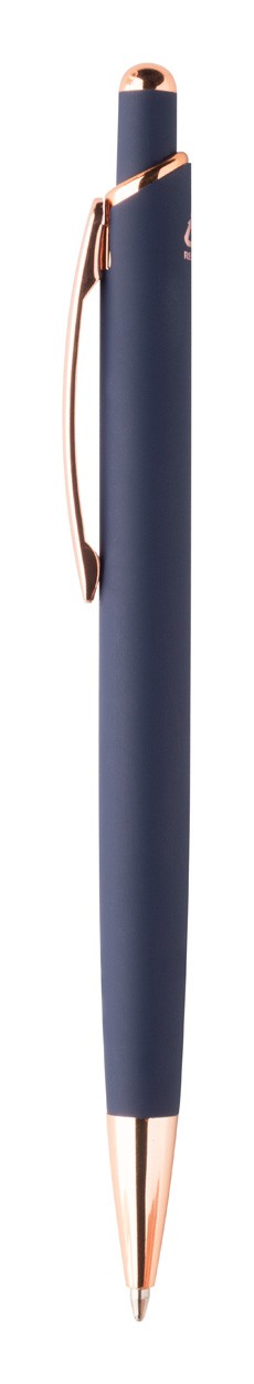 Pix din aluminiu reciclat, cu finisaj cauciucat și detalii auriu roz. Cu acoperire specială pentru gravarea laser în oglindă în culoarea aur roz. Cu mină albastră.