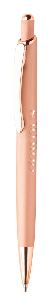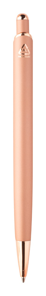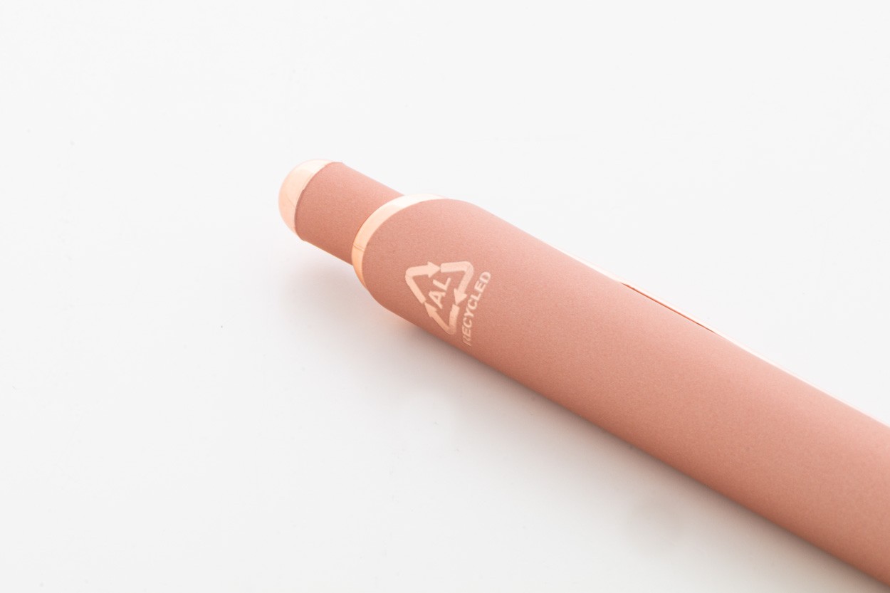 Pix din aluminiu reciclat, cu finisaj cauciucat și detalii auriu roz. Cu acoperire specială pentru gravarea laser în oglindă în culoarea aur roz. Cu mină albastră.